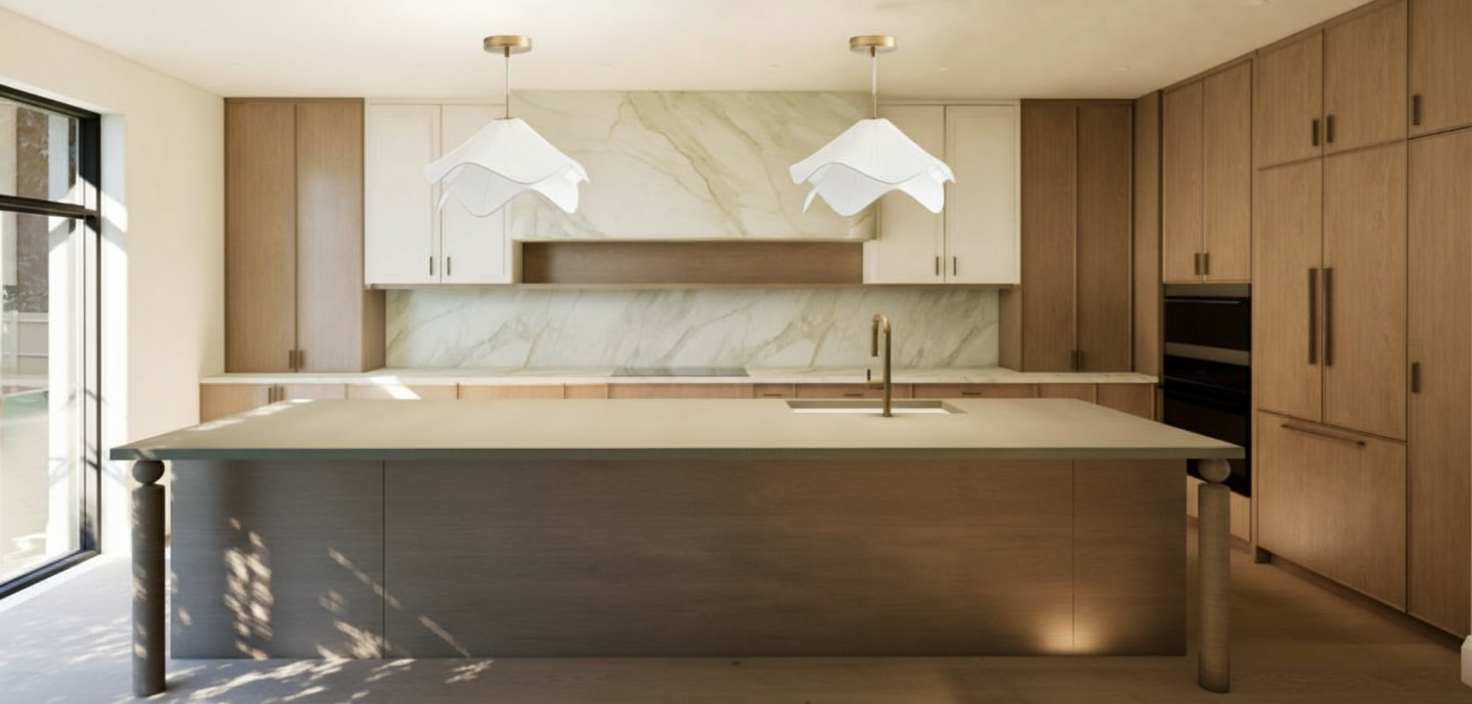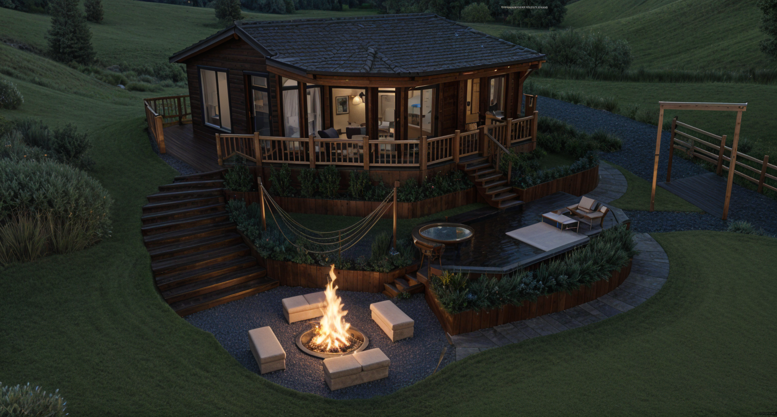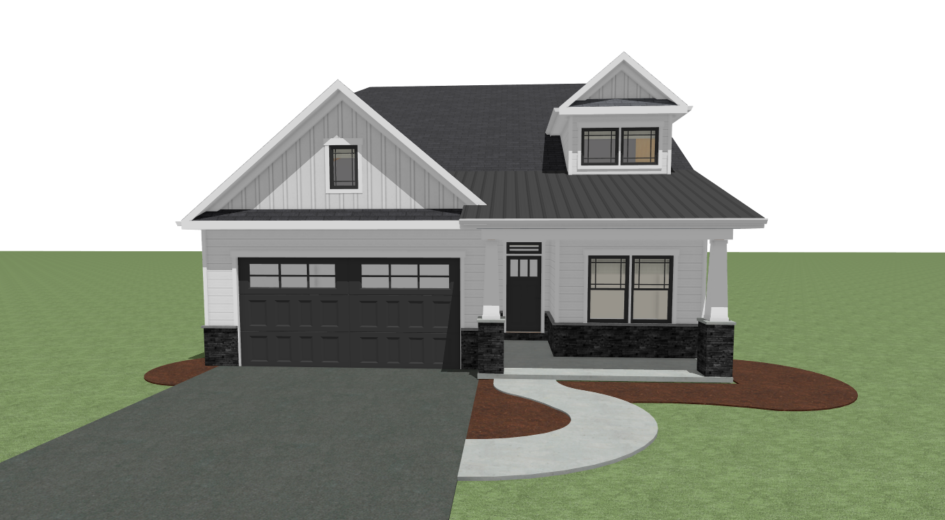render this 3d image to appear photo realistic maintain all existing architectural materials and structural elements exactly as shown enhance the setting with a well maintained landscape include minimal beds manicured shrubs and a tree lined backdrop that frames the home naturally the windows should have a glossy finish with clear reflections of the surrounding trees and sky lighting should feel natural with soft shadows and realistic depth to bring the scene to life