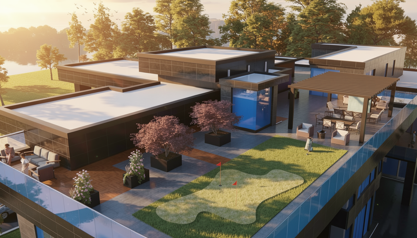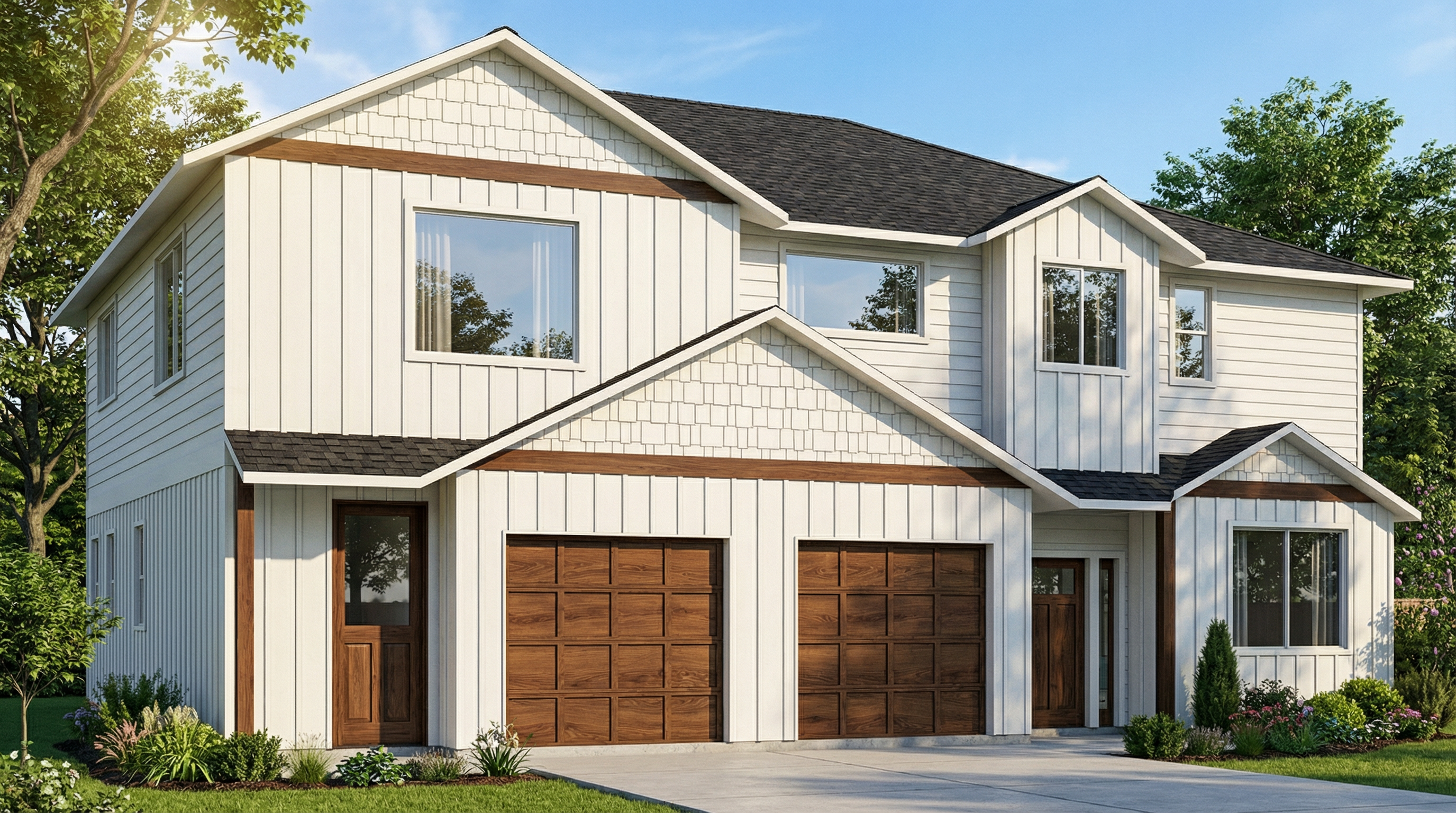 make this more realistic enhance the materials daylight and airy atmosphere with clouds the lights are dimly visible through the windows the environment is central texas with trees and a residential fence remove the shadow people lights are o nin the windows