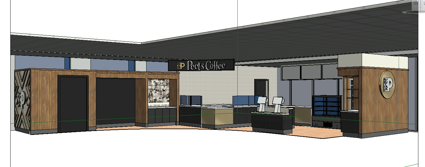 render this image with materials and elements as shown the shop should be set inside the phoenix airport concourse d terminal 4