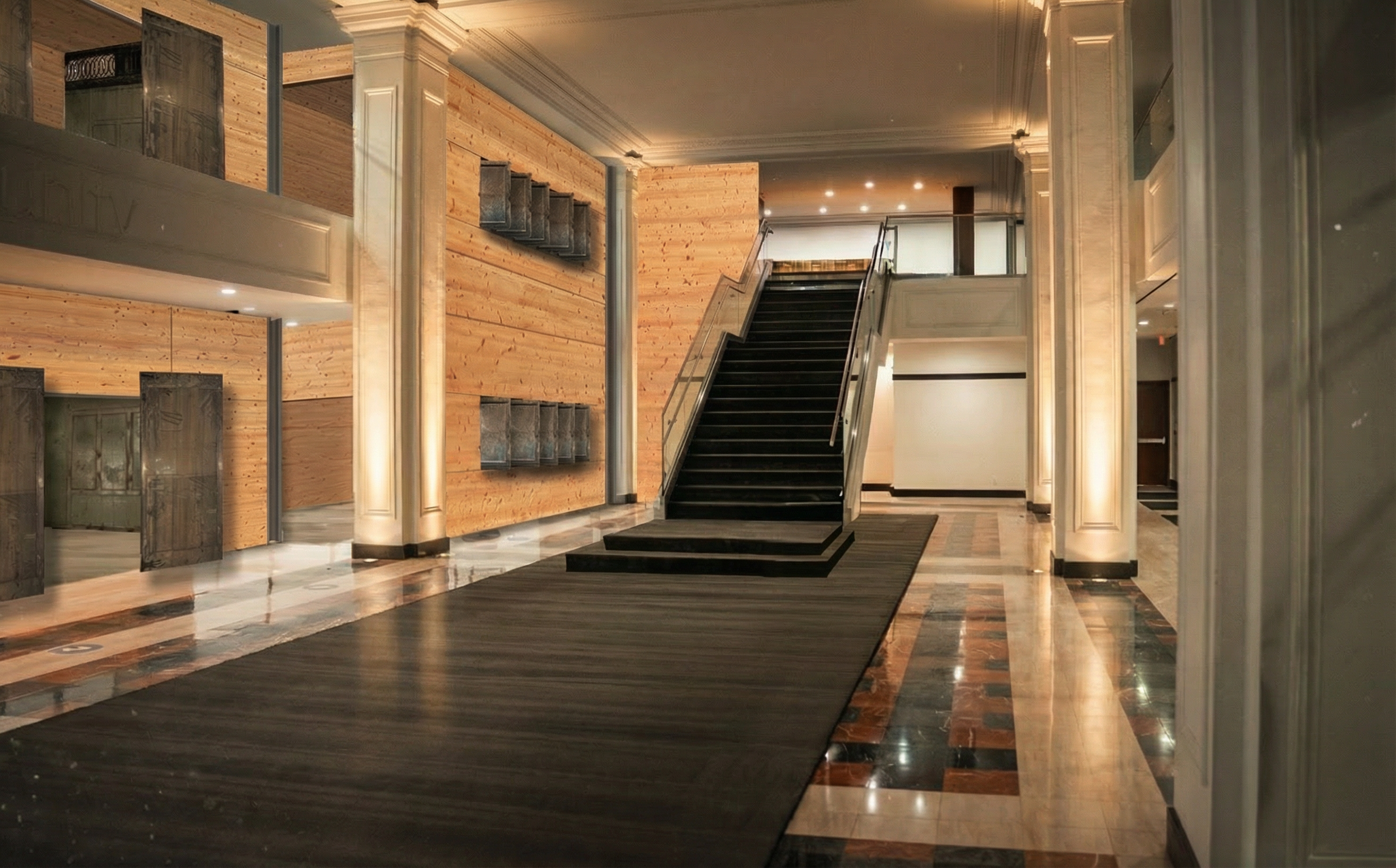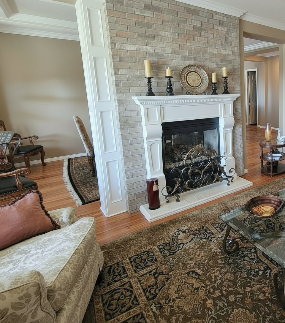 copy wall panel column around doorway and add to other side of fireplace maintain same furniture textures and colors