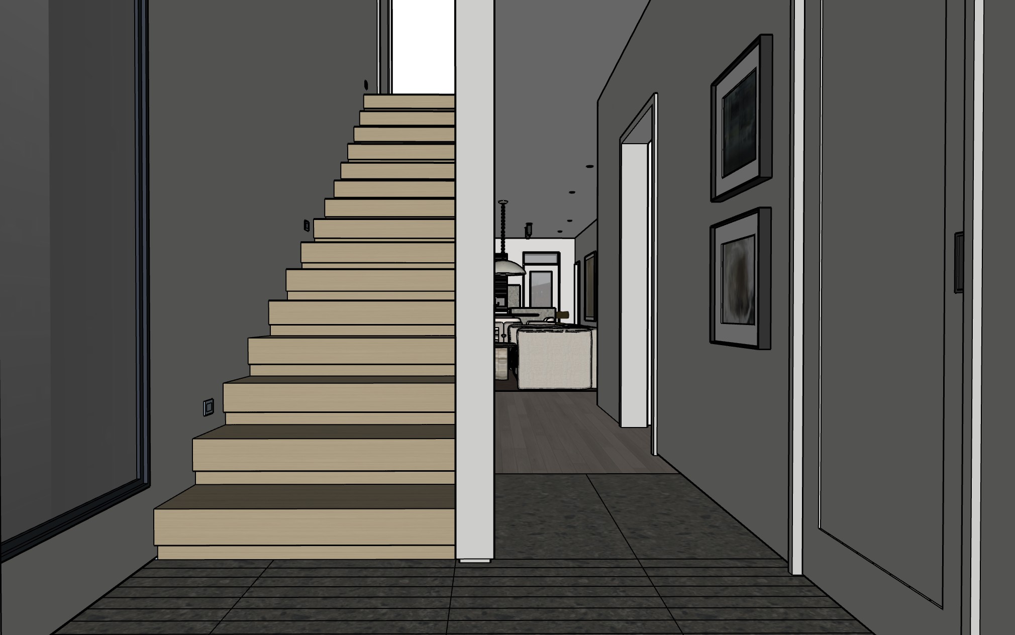 all the walls are white the white rectangle on the left side is mirror so add reflection put a wall at the top of the staircase with no window its a flat wall