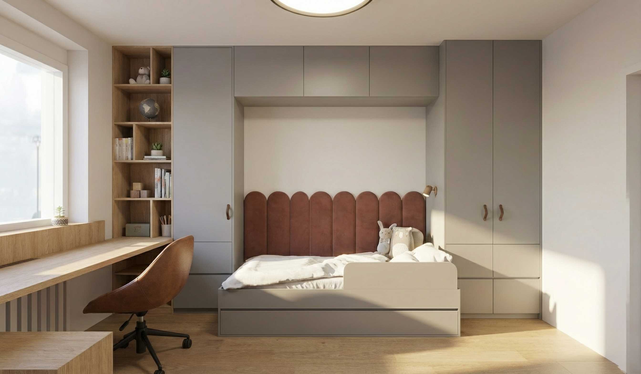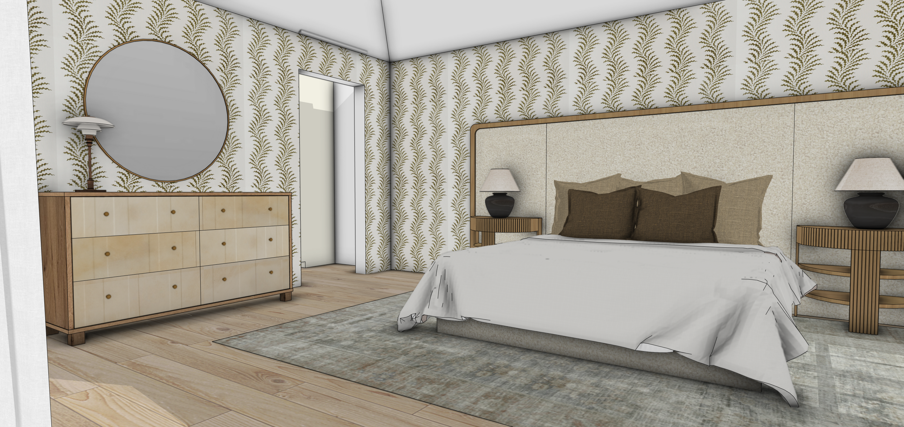 photorealistic interior bedroom rendering with soft natural lighting and refined materials maintain the exact furniture layout proportions and design intent upholstered headboard and bed should feel plush and realistic with natural fabric texture wood furniture should show subtle grain and warmth wallpaper should read clearly with soft depth not flat or graphic bedding should have gentle folds and realistic drape warm daylight balanced exposure and soft shadows throughout clean calm high end residential atmosphere avoid over stylization or dramatic lighting the dresser material and overal details are not as shown in the uploaded image try again to more accuratley render the dresser