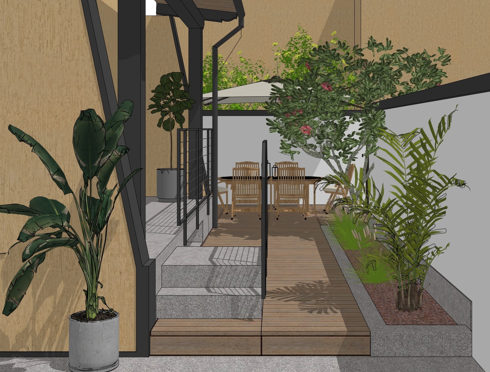 create a serene modern outdoor patio scene with a warm welcoming atmosphere envision the deck in a rich warm brown contrasted by sleek dark gray metal railings dark fray painted wood structure the walls display a soft earthy yellow creating a cozy backdrop surround the scene with lush greenery add vibrant green potted plants with large leaves for a tropical feel include a variety of plant shades with some hints of pink and red flowers to add a touch of color and life the tile stone effect steps and pathways should exhibit a textured light gray complementing the stone planter wooden chairs around the table should have a light natural wood finish adding to the inviting ambiance illuminate with soft warm lighting to enhance the tranquil atmosphere