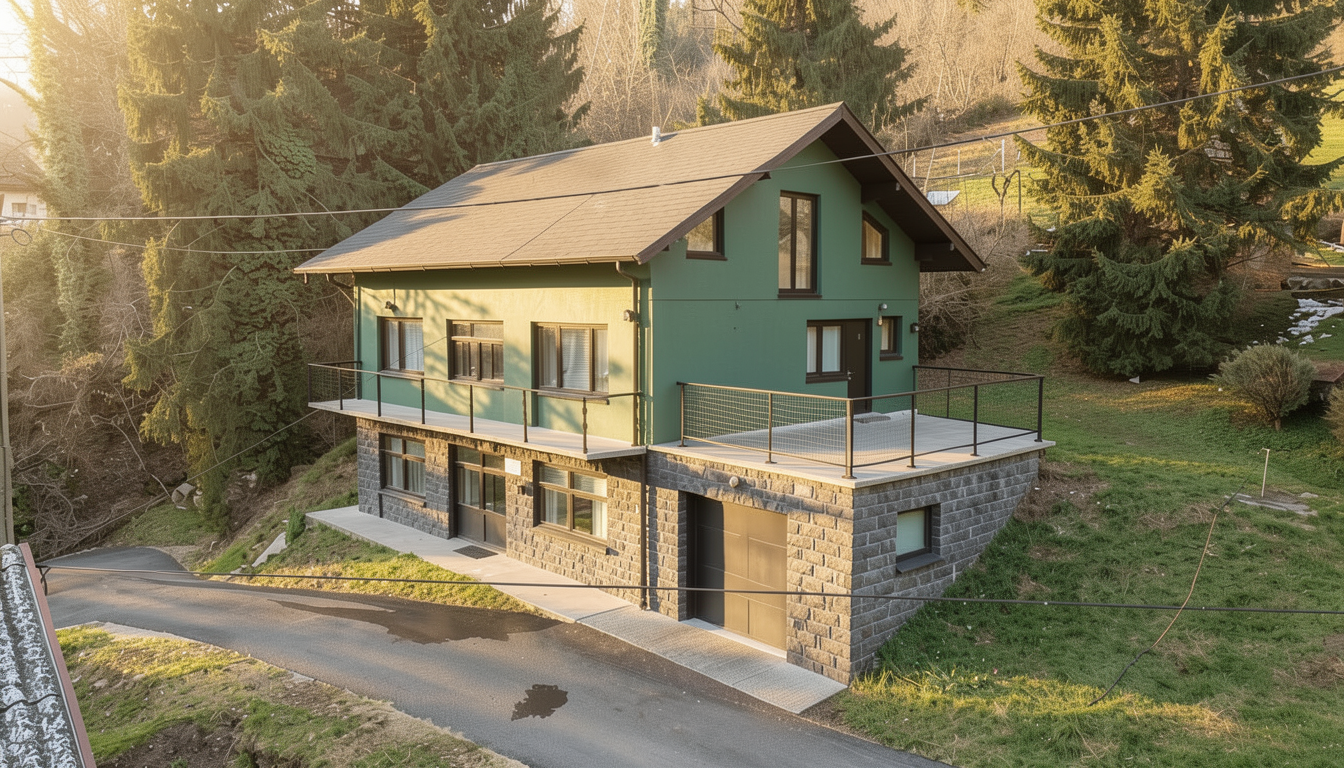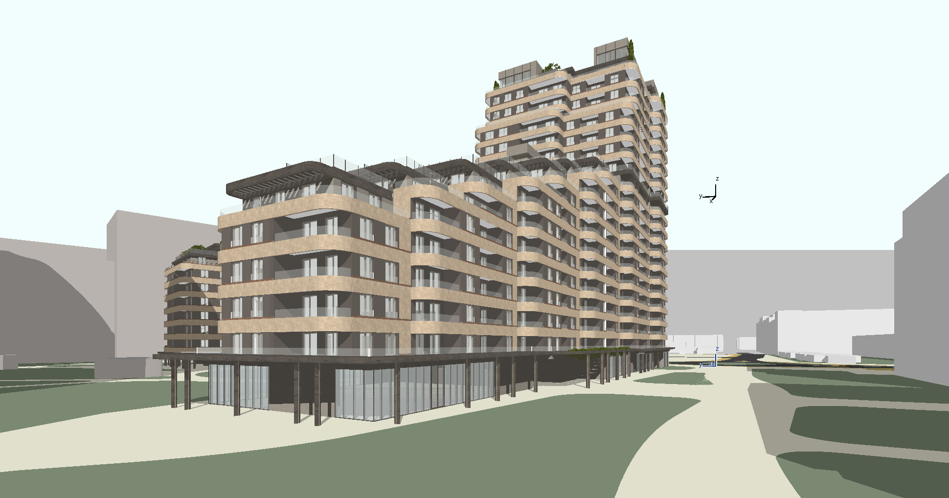 how photorealistic architectural photography low angle wide perspective using a 35mm lens deep depth of field ultra sharp professional real estate style capture emphasizing fa ade curvature and layered terraces what a multi level contemporary residential complex composed of stepped apartment volumes with smooth rounded balcony edges continuous glass balustrades horizontal brick cladding lush integrated planter boxes on every terrace a landscaped podium level with dark stone structural columns supporting the upper housing mass rooftop gardens and pergola seating areas where located on the edge of a newly developed suburban district with open green corridors surrounded by low density modern buildings and wide pedestrian paths positioned along a quiet street with native meadow landscaping and gently sloping terrain who style organic contemporary architecture with flowing horizontal massing soft modernist geometry biophilic residential design integrating vegetation into fa ade terraces when clear midday daylight with soft natural shadows and bright sky illumination light scattered clouds palette warm natural tones dominated by sandy beige brick warm grey plaster between windows charcoal stone podium base transparent glass railings fresh botanical greens neutral sky blues mood calm upscale livable environmentally integrated urban living atmosphere format 16 9 landscape composition street level viewpoint looking slightly upward toward the cascading residential tower architectural visualization framing additional ultra detailed surfaces physically accurate materials realistic reflections on glass crisp foliage detail 8k resolution emphasize balcony rhythm and layered terraces no vehicles minimal human presence