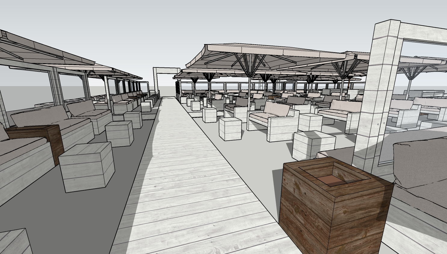 dit is een strand bar voorzie de zee op de achtergrond in de verte voeg mensen toe maak het fotorealistisch materiaal zijn wit geverfde houten planken graag kleine olijfboompjes toevoegen in de bruin houten bloembakjes
