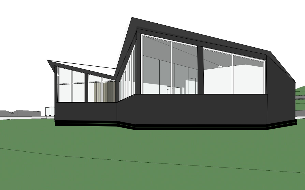 preserve building geometry and proportions harden edges to keep realistic do not redesign structure modern bathouse spa welness centre with internal spa saunas and ice baths dark burnt cladding black vertical charred timber cladding matte finish slim black aluminium frames concrete fire pit in distance smoke and warmth coming from fire glazing should show tinted exterior reflections with subtle warm interior glow adapt colour natural warm tones inside dark tiles and microcement giving an ultimate welness experience freestanding spa in side see steam coming from it earthy retreat landscape hierarchy low native grasses near villa only pathway lighting positioned evenly along path edge only no random scattered lights vineyard rows clearly in mid to far background distant tree line on ridge time of day late blue hour getting darker soft glaze soft sky gradient controlled lighting realistic shadow depth premium winery retreat mood negative no added furniture no dramatic spotlighting no suburban garden styling no cinematic overexposure
