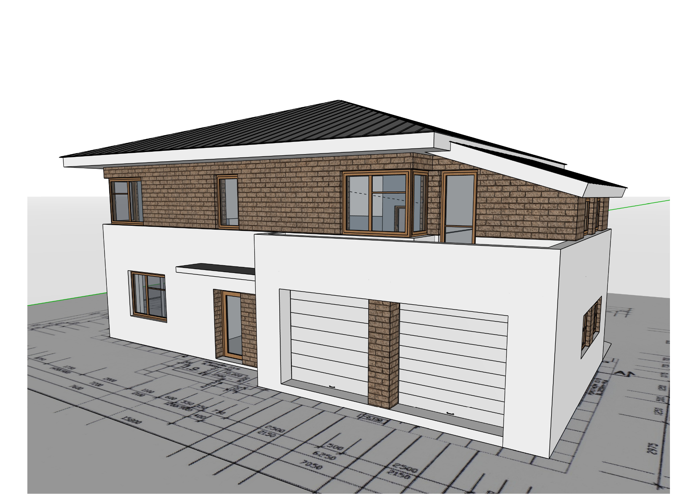 ultra photorealistic architectural visualization based exactly on the provided reference image preserve 100 of the original geometry proportions camera angle perspective field of view building massing and all architectural elements do not modify layout materials placement window positions or structural composition architecture materials modern two story family house with a clean minimalist composition upper floor fa ade warm brown brick cladding slightly textured natural variation realistic joints ground floor fa ade smooth white plaster matte finish subtle imperfections roof dark standing seam metal roofing slightly reflective fine detail window frames natural wood oak tone satin finish garage doors white sectional panels minimalistic subtle horizontal lines entrance canopy flat modern slab dark grey anthracite top surface precise material transitions brick plaster metal lighting setup critical time of day late afternoon golden hour lighting soft warm sunlight from a low angle approx 25 35 long soft shadows with high realism global illumination enabled light bounce from white fa ade onto brick surfaces slight warm color grading cinematic but natural environment ground clean architectural context subtle concrete paving minimal distraction surroundings soft blurred neutral environment no dominant objects sky clear sky with slight warm gradient physically accurate light behavior optional very subtle hdri reflection in windows glass reflections physically correct glass ior 1 52 subtle interior hints no full interior scene needed realistic reflections of sky and surroundings slight dirt imperfection for realism very subtle rendering quality ultra high resolution min 4k ideally 8k physically based rendering pbr workflow ray traced reflections and shadows high micro detail surface imperfections roughness variation no noise no blur artifacts sharp edges clean geometry post processing slight contrast boost soft cinematic tone mapping very subtle vignette no overexposure natural color balance avoid oversaturation strict constraints do not redesign anything do not change materials or colors do not add vegetation people cars unless explicitly requested do not stylize keep strictly photorealistic no artistic interpretation only realism strict geometry lock no interpretation no design enhancement no added objects photorealism priority architectural accuracy enforced