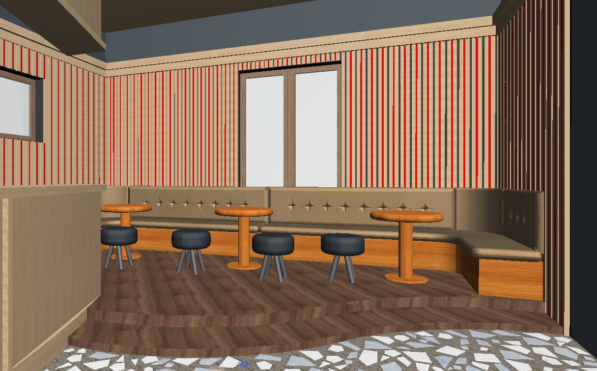 transform the provided restaurant interior image into a high end photorealistic render with a warm golden hour atmosphere soft glowing highlights and a relaxed upscale coastal energy while keeping everything exactly the same same proportions same bar shape same booth seating same wall finishes same materials and the same spatial configuration do not move or alter any objects geometry textures colors or furniture positions the chairs throughout the restaurant must remain exactly in the same locations and proportions but their materials should read realistically the bar stools should appear upholstered in dark blue leather with a subtle natural sheen and cushioned tactile texture the wall should be the same color as the chairs transform the red lines on the walls into integrated led light strips that follow the exact same paths positions and proportions as the original lines emitting a refined continuous glow with a subtle diffused edge enhancing the ambient lighting without altering the wall geometry or design lighting should emphasize golden hour warmth gentle reflections soft shadows enhanced color richness and luxurious catalog level realism improve depth and realism through wood grain richness marble shine brass highlights fabric texture and polished clarity while keeping the entire scene exactly as originally designed