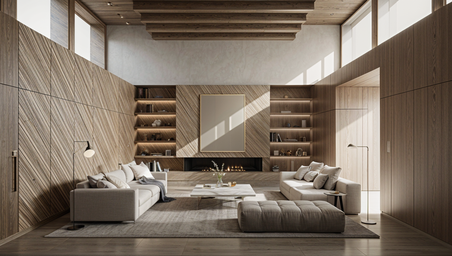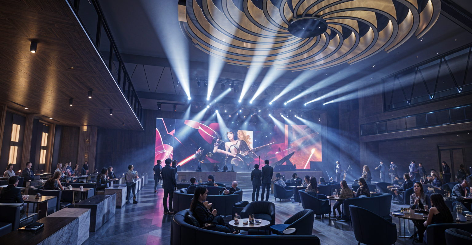 functionalism wide angle shot keep the exact camera angle distance and perspective from the supplied image do not move the camera or change focal length convert this scene into a photoreal upscale nightclub at night preserve the architecture exposed steel trusses balcony railings ceiling height stage shape wood fascia rigging positions and the single led wall do not change the geometry the audience area in front of the stage is a sunken dance floor that sits lower than the surrounding level the perimeter walkways and lounge platforms around it are higher preserve this elevation change do not flatten the floor levels add dramatic stage lighting with visible beams and subtle haze originating from the existing fixtures on the truss the single led wall should be slightly dimmer than the stage lighting display one unified abstract motion background clean and consistent no collage no text no logos no photos add a rectangular picture in picture imag overlay inside the led wall content as if routed through a switcher the led wall is the only screen do not add any other displays add upscale lounge seating with premium materials like leather velvet brushed metal and dark wood around the higher perimeter areas increase patron density patrons should face the stage and pay attention to the performers use polished concrete flooring with soft reflections lighting is warm and architectural mood is modern exclusive energetic concert ready architecture