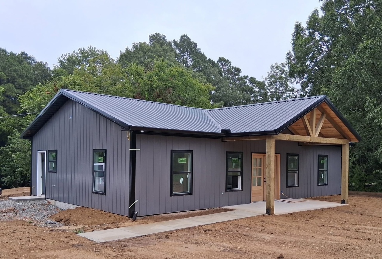 render a beautifully rustic house with a modern barn design featuring a dark grey exterior with natural wood posts the roof should be a matching grey metal the ground around the house is a rich earthy red clay with scattered grey gravel paths surround the building with leafless trees in muted tones reflecting a calm overcast atmosphere the overall mood is serene and slightly moody evoking the feeling of a cozy autumn afternoon
