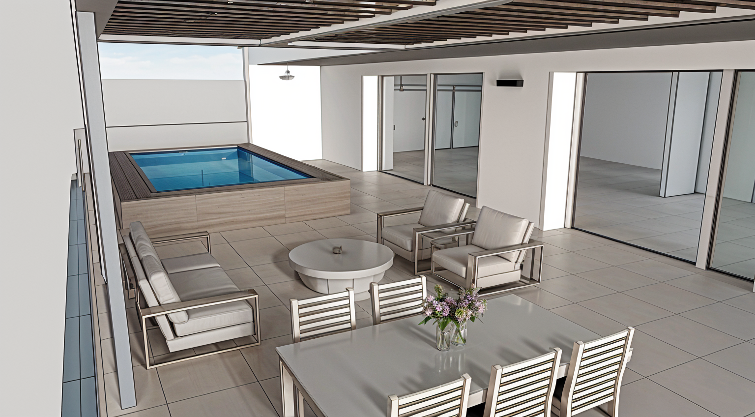 exterior shot add interior furnishings and add some buildings in the background architecture