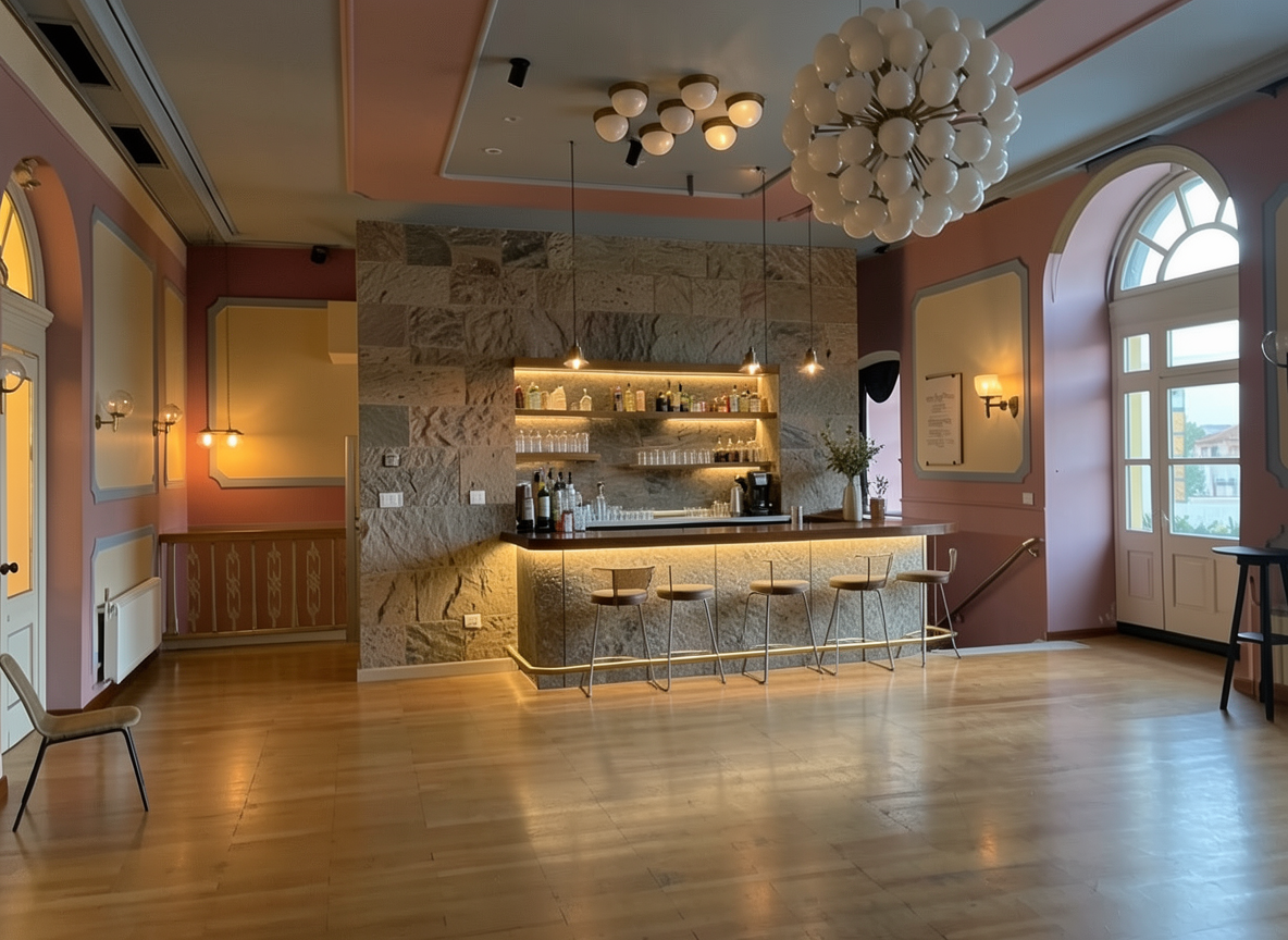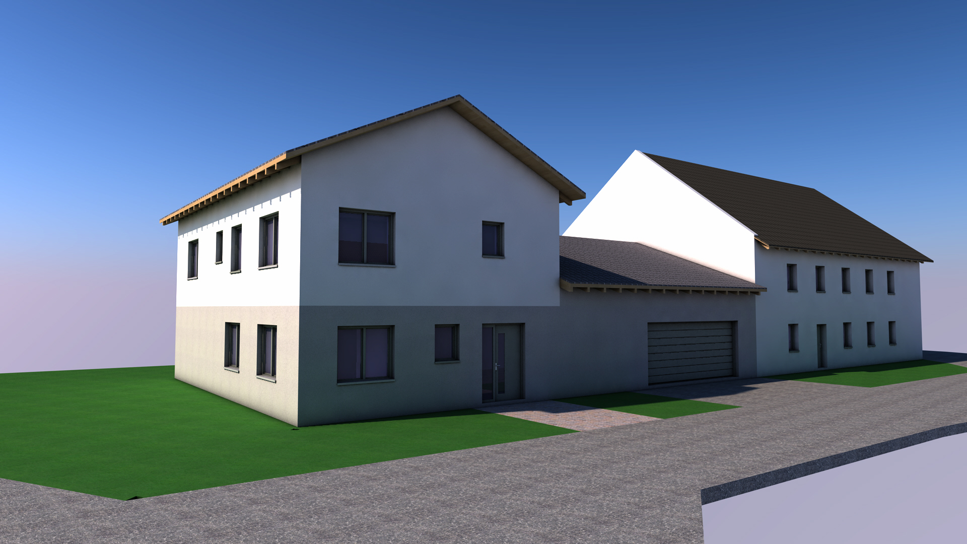 das fassadengrau etwas heller nur die fenster t ren und tore schwarz ein baum auf der gr nfl che ein auto vor dem garagentor