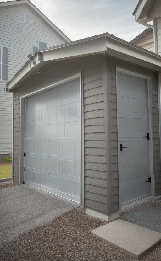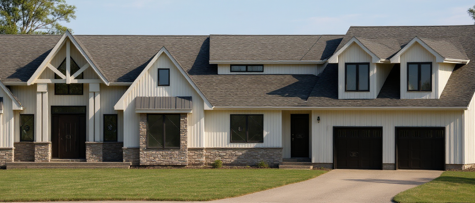 this is the right side elevation of the house and i need this exact view i need this to look realistic with horizontal dark grey siding black trim and black shingled roof on a grassy lot with trees in the background from this current angle