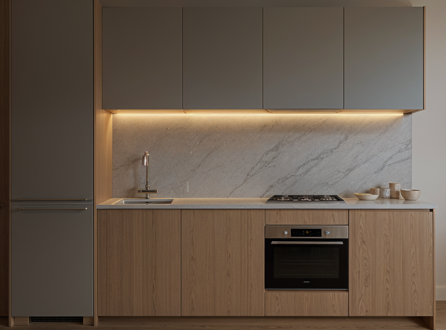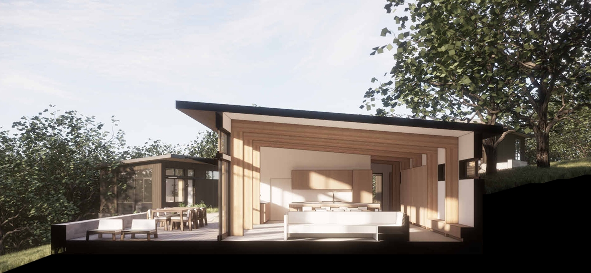 modernist exterior aerial shot of a minimalist home compound nestled in a green wooded landscape the buildings feature dark standing seam metal roofs and natural wood siding contrasted with expansive glass walls the architecture is low and horizontal blending with the terrain while large windows invite views of the surrounding forest the roof overhangs are extended to create generous covered outdoor living areas that frame patios and seating spaces the lighting is soft and natural similar to the attached rendering evoking a calm late afternoon atmosphere sunlight filters through the trees casting delicate shadows across the roofs and terraces the mood is serene and elegant highlighting the connection between modern design and the quiet natural environment