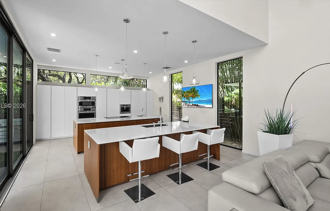 make all cabinets walnut color as reference image and replace ceiling pendants with image provided