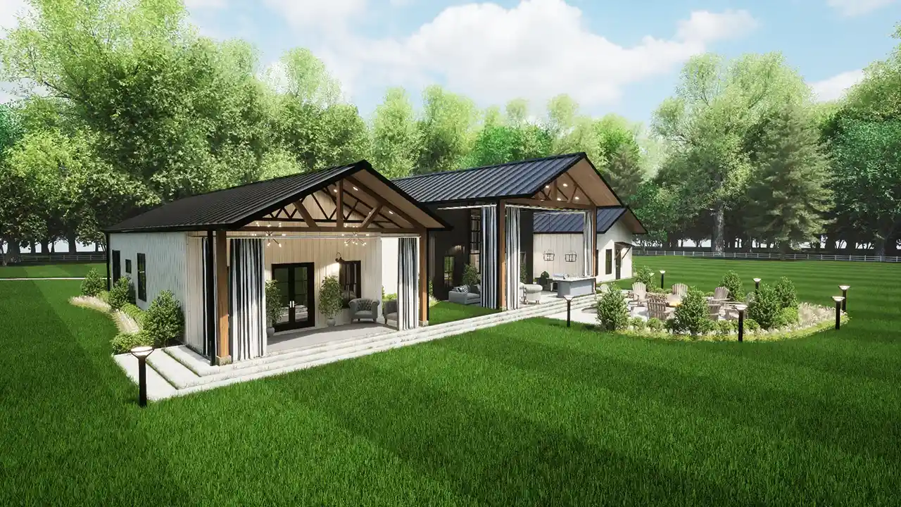 change the roof and white exterior on all buildings to black vertical steel