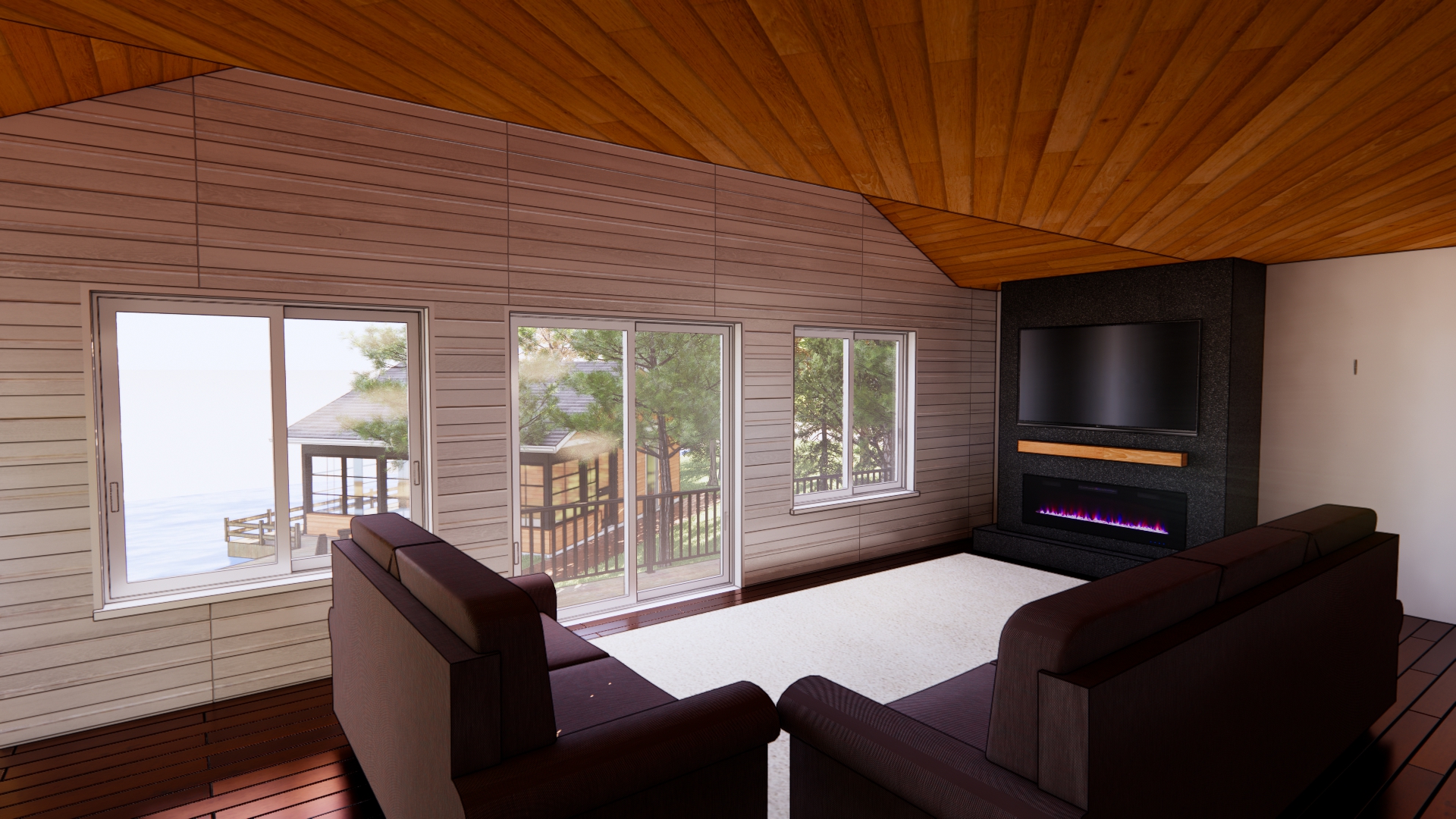 photorealistic architectural visualization of a warm modern lake living room at brereton lake viewed from outside through full height patio sliding doors early autumn setting mature trees with natural variation in golden yellow muted orange and soft green foliage visible across the water calm lake surface with a small contemporary boat docked at a simple private wooden pier interior is modern but relaxed clean lined neutral sectional with textured throw blankets casually draped and layered pillows in rust cream and muted olive tones styling feels intentional but not staged recessed pot lighting with warm 2700k glow softly illuminating the ceiling and creating depth without harsh shadows balanced ambient lighting that complements golden hour exterior light wall mounted minimalist tv displaying a subtle low contrast nature scene that doesn t pull focus from the space natural wood flooring warm wood accents soft woven area rug realistic glass reflections soft depth of field professional architectural photography style clean refined cozy but elevated