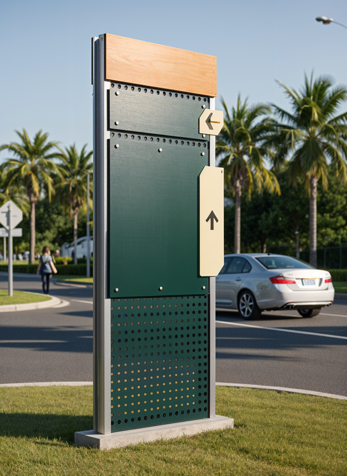 perspective shot please take the uploaded signage design and render it as a realistic 3d external floor mounted vehicular signage the signage width is 1100 mm place the signage on a roadside grass curb during a sunny afternoon with palm trees in the background position it just before a left hand turning in the road show a blurred car passing in the background and ensure the scale feels correct by also referencing typical pedestrian height the signage construction is industrial in approach a solid 2x1 stainless steel frame a perforated metal background panel and aluminum composite panels attached to the perforated surface emphasize realistic daylight shadows metallic reflections panel textures and natural grass detail render from a dynamic perspective view to highlight both the structure s sturdy construction and its integration into an elegant roadside environment