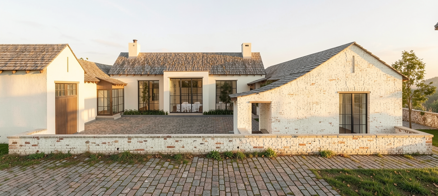 create a beautiful architectural rendering of a large elegant house with a detailed facade use warm beige tones for the walls accented with dark brown trims the windows should have a reflective glass effect capturing subtle hints of the surrounding landscape add muntin grids in all the windwos for an old world effect for the roof terracotta tile texture to create a sense of durability and style the surrounding landscape should include a paver patio and bbq area and stone steps descending a terraced rock garden gentle sunlight casting soft shadows to create a serene and welcoming atmosphere
