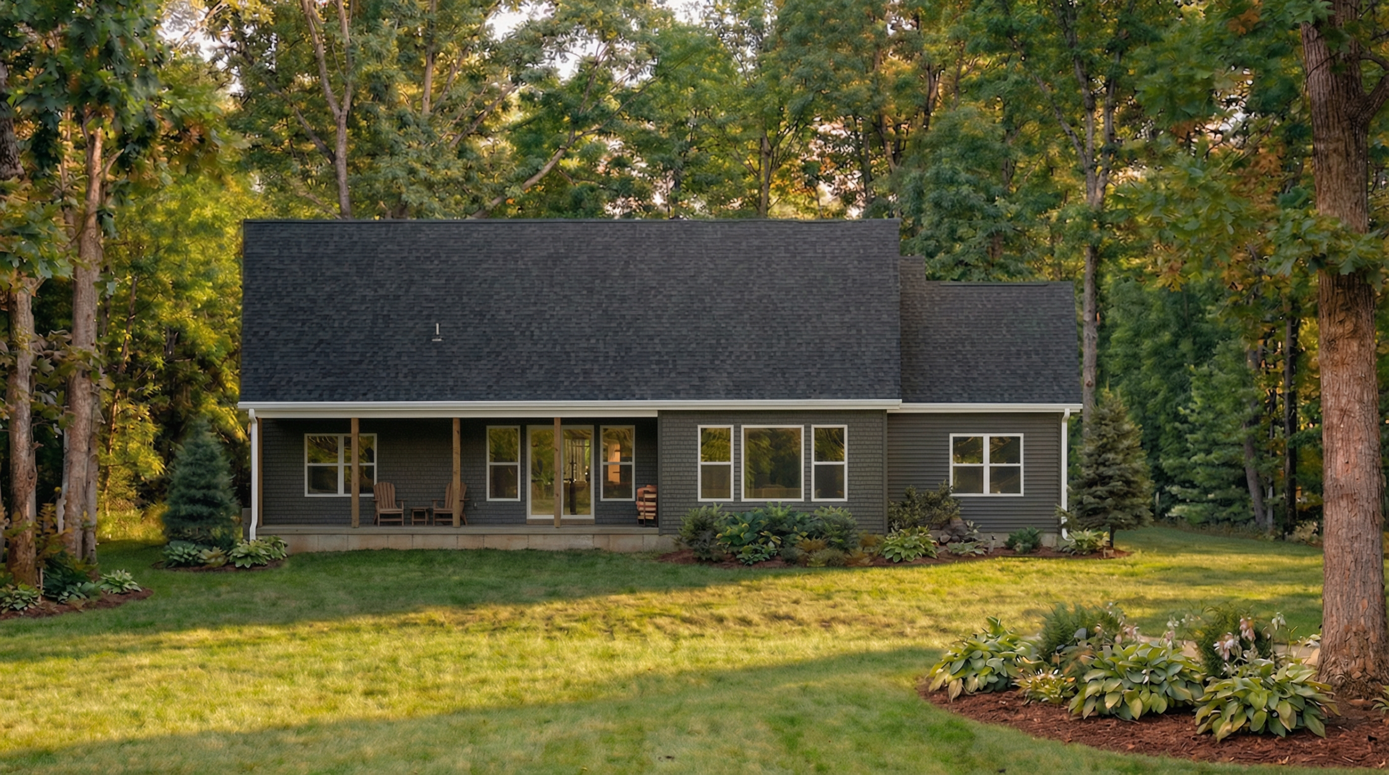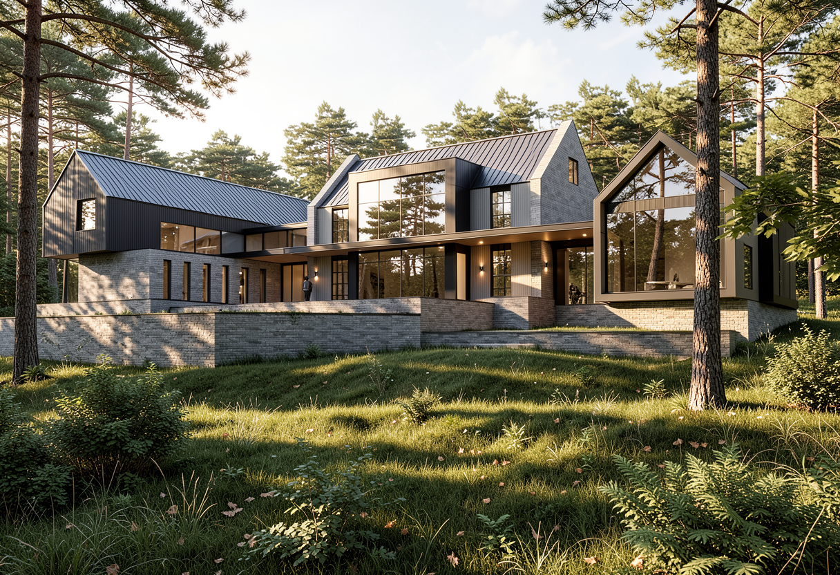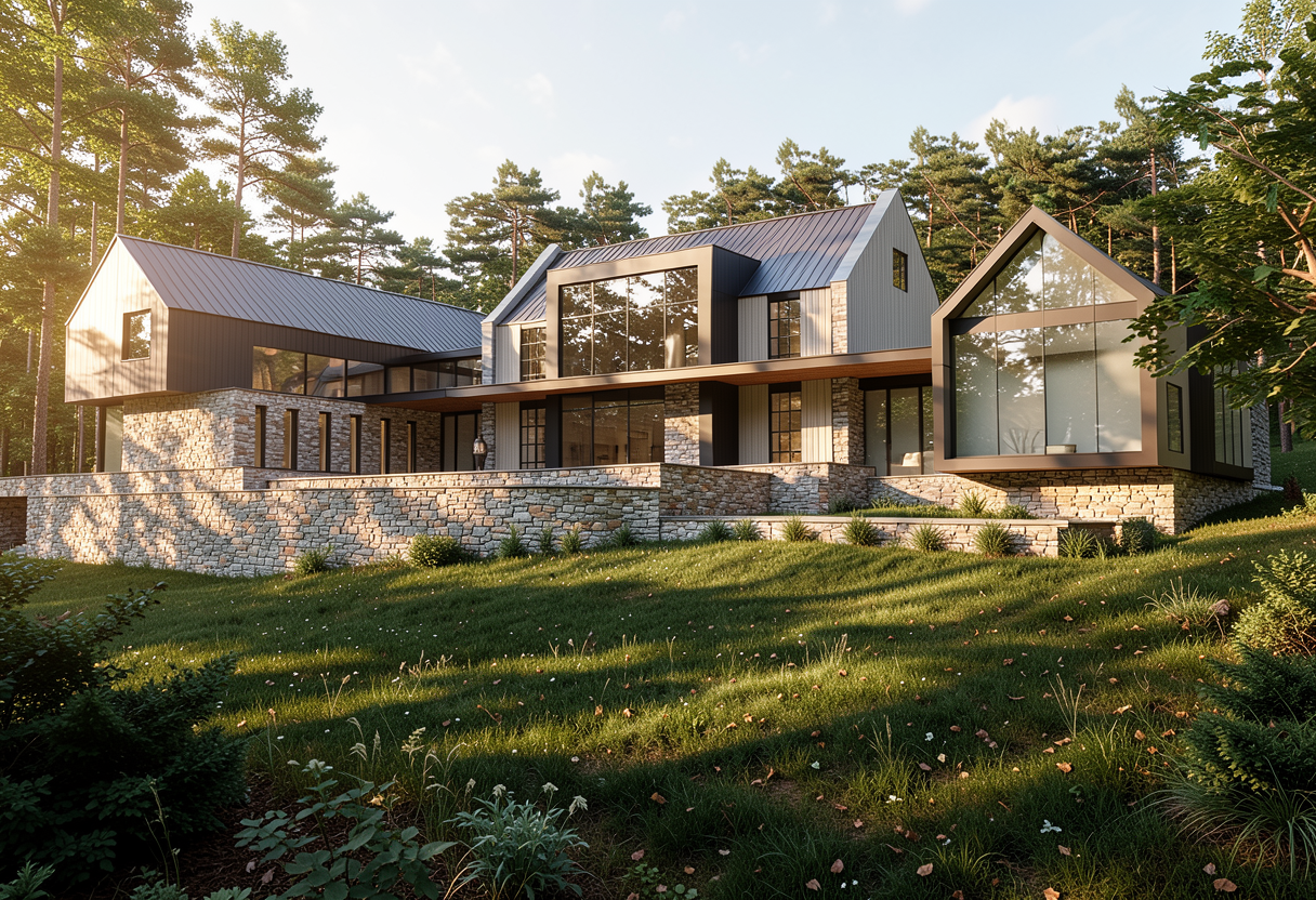 realistic perspective of tennessee modern home keep materials stone accent forest