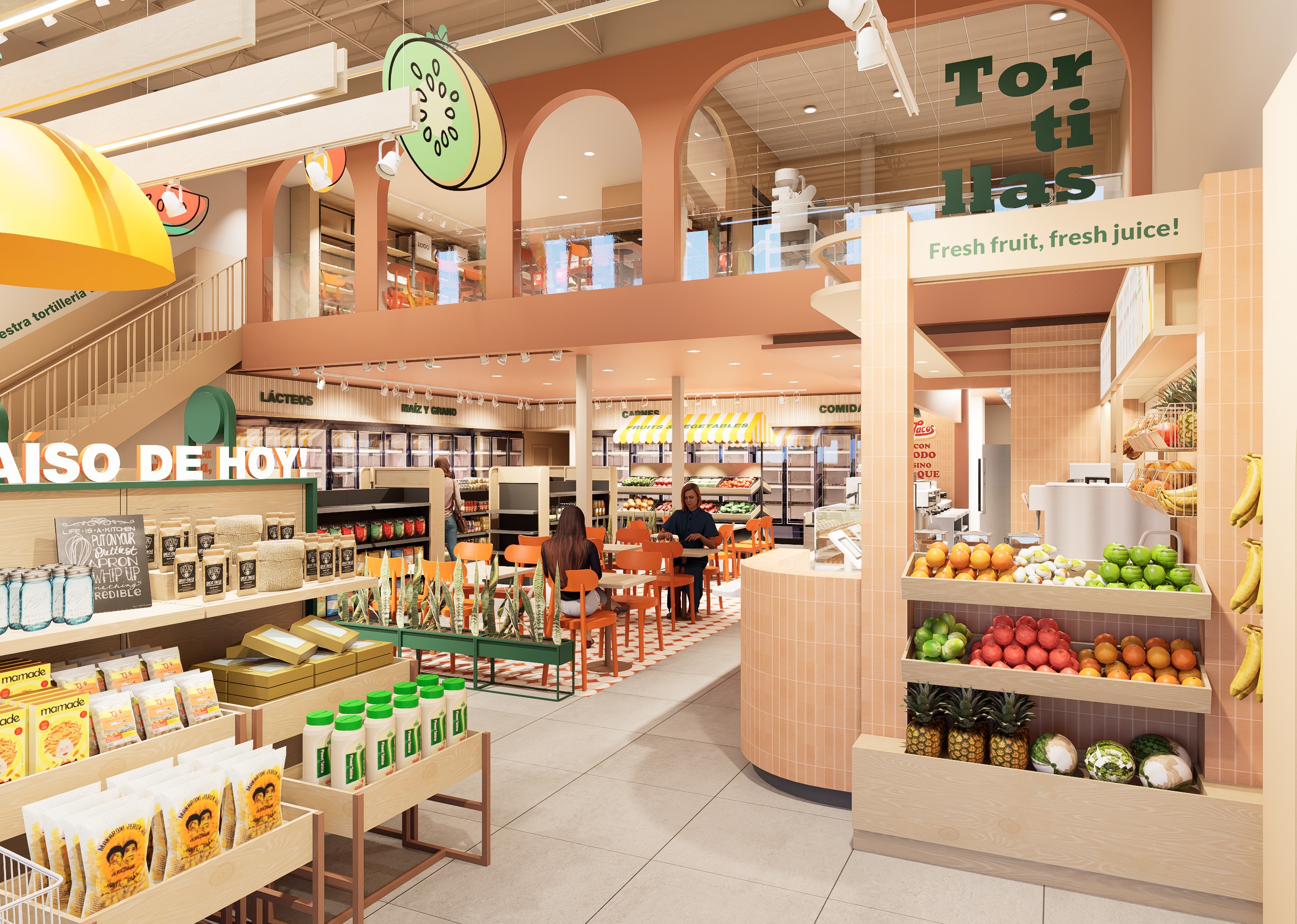 enhance the existing architectural scene with minimal intervention add one realistic person only approaching the service counter naturally as if about to place an order casual posture everyday clothing neutral colors not posing for the camera improve overall lighting quality while preserving the original lighting intent slightly brighter ambient light for better clarity and realism warm accent lighting enhanced subtly on the counter area balanced exposure soft shadows no dramatic naturalycontrast one staff member behind the fruits looking down prepearing something small group of customers seated at the central tables casually eating tacos complete shelving with grocery product maintain exact architecture furniture materials textures colors signage and layout as in the original image photorealistic integration correct human scale soft contact shadows architectural visualization quality no additional people no new objects furniture products or decorations no changes to materials colors textures or geometry no stylization no cinematic lighting no artistic reinterpretation subtle lighting enhancement only realistic retail interior lighting
