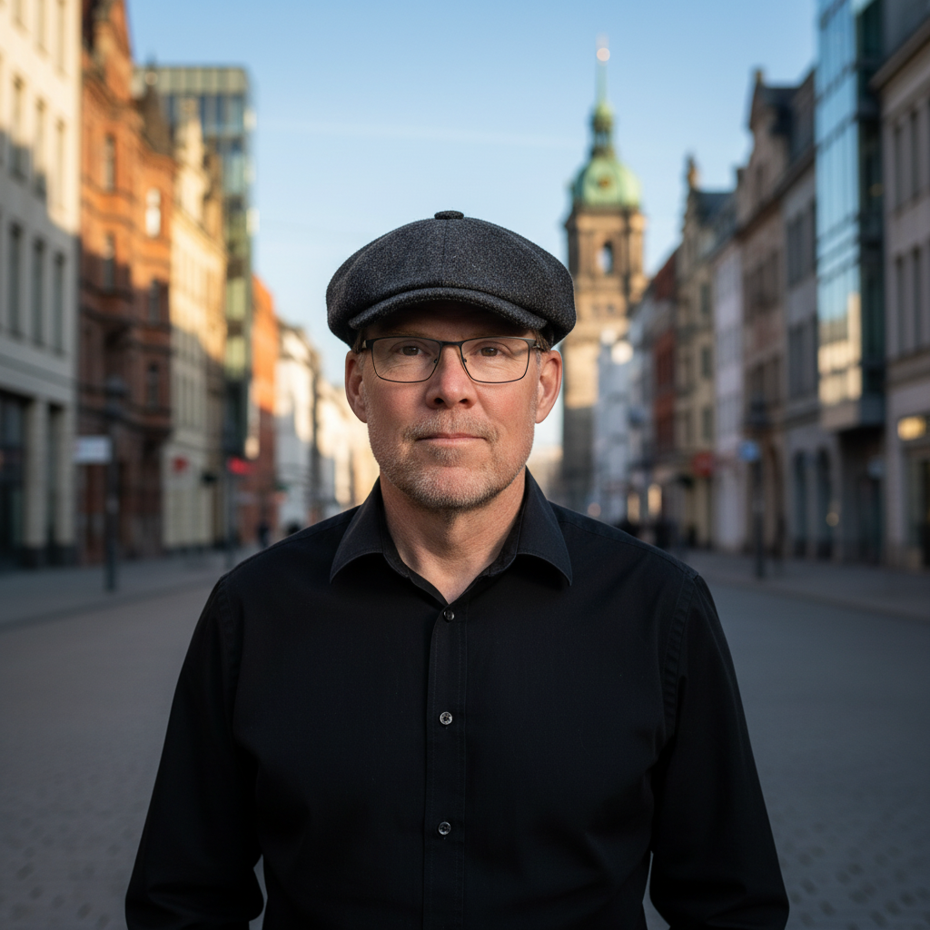 carlo scarpa night shot place in architecture low lighting black button down remove face wrinkles add wire rim glasses and a peaky blinders cap architecture