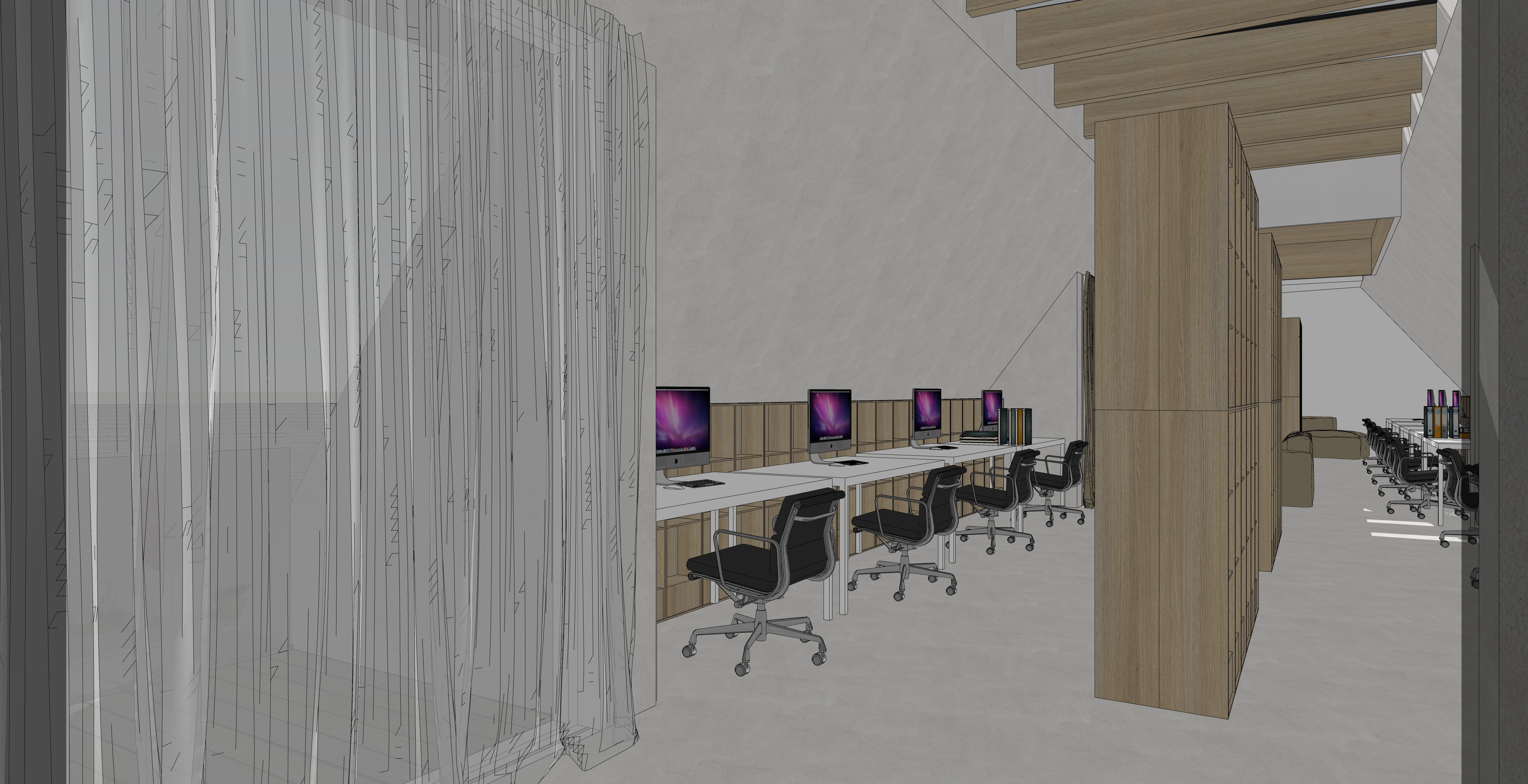 office space in the attic illuminated by the upper windows that are between the wooden beams soft light add office supplies to the table add books to the shelves wooden parts bleached oak curtains white