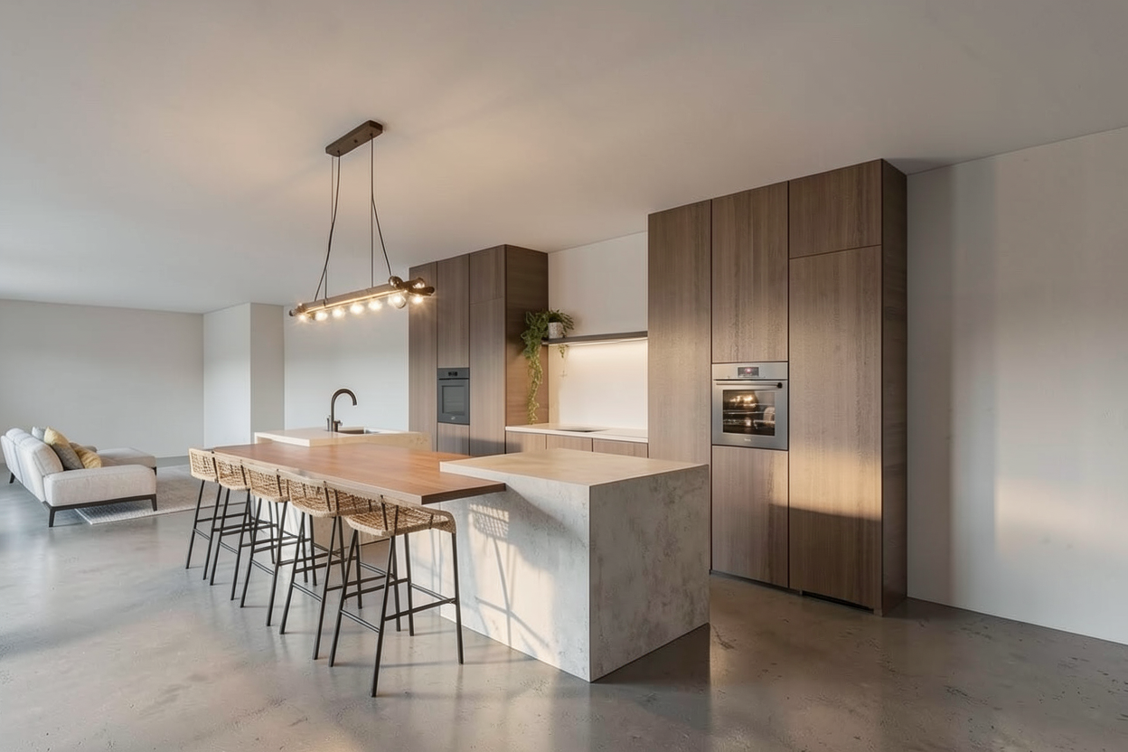 make a photorealistic render wtihout changing the perspectif keep the materials close to the original put a hanging horizontal light the kitchen island dont add windows or doors