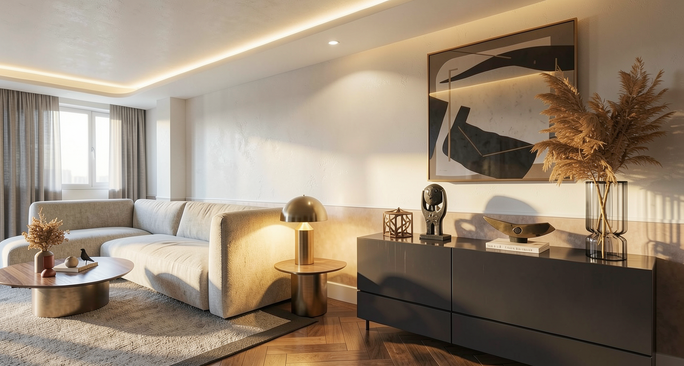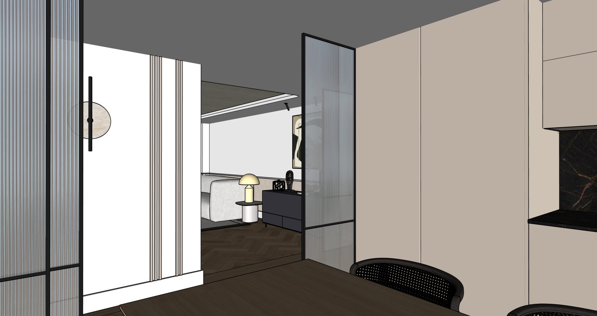 crea una imagen fotorealista a partir de esta de sketchup realza las texturas e iluminacion para que queda todo natural y realista a ade ilimunacion en el foseado del techo que aparece al fondo a ade algo de menaje encima de la mesa