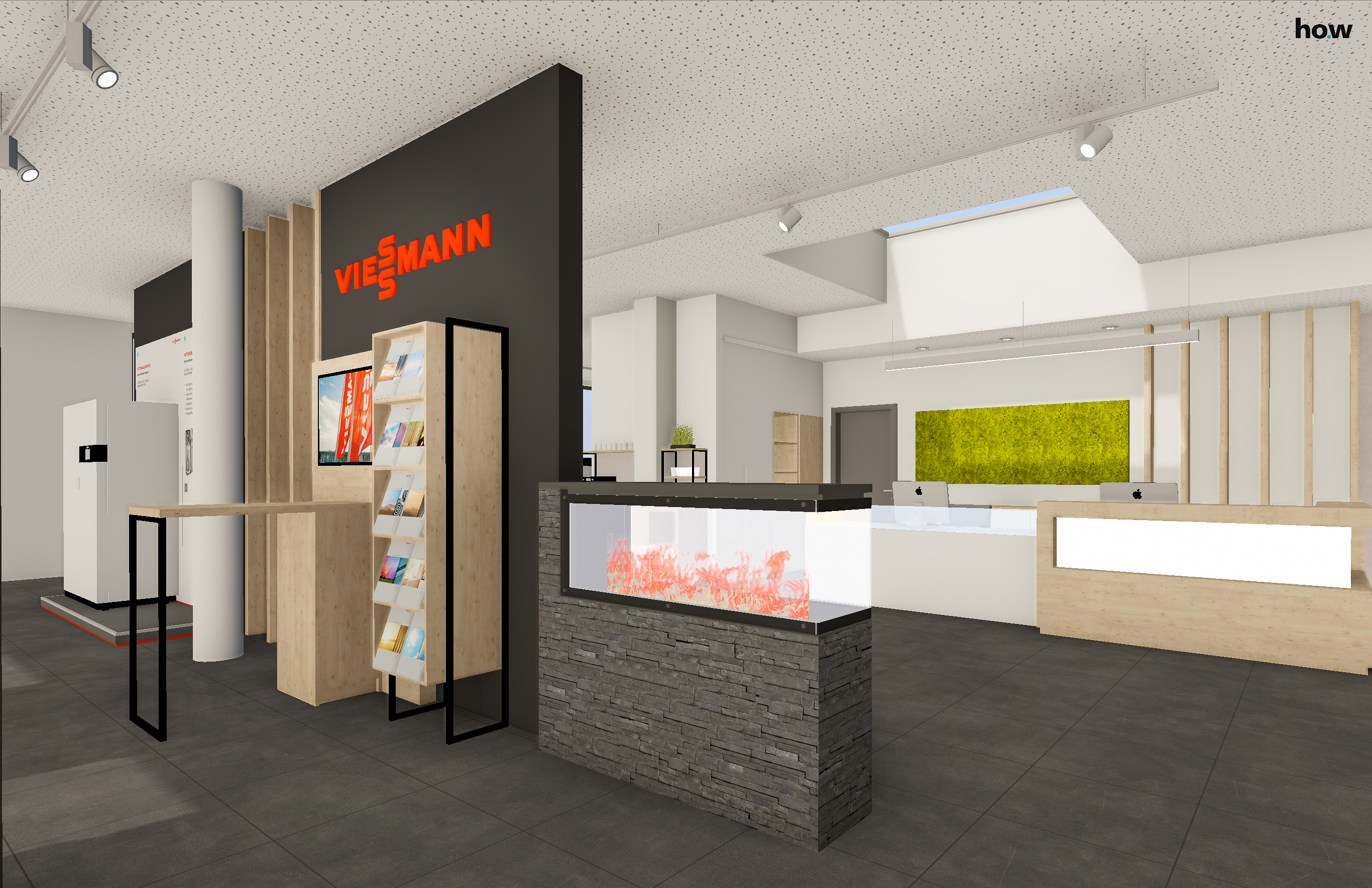 render a modern showroom with sleek design elements the atmosphere is bright and inviting use a soft white color for the ceiling with dotted patterns to enhance texture walls are a mix of grey and white with a prominent black accent wall featuring bold orange text incorporate wooden fixtures in a light oak finish the floor is a dark gray tile for contrast include an elegant stone facade for the display counter with a vibrant illuminated aquarium showcasing vivid orange foliage integrate a refreshing green vertical garden on the back wall for a touch of nature the lighting is modern and minimalist creating a well lit spacious setting