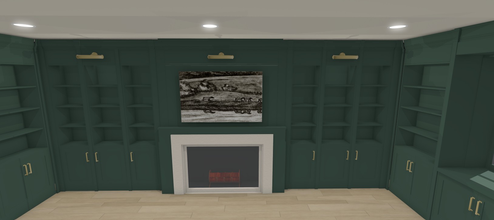 high end 3d rendering of a traditional stately cozy living room floor to ceiling dark olive green bookshelves with a scattering of ivory colored books throughout a lit fireplace is in the center of the room with a large beveled edge limestone surround white oak natural wood flooring soft shadows photorealistic unreal engine 5 8k architectural photography style