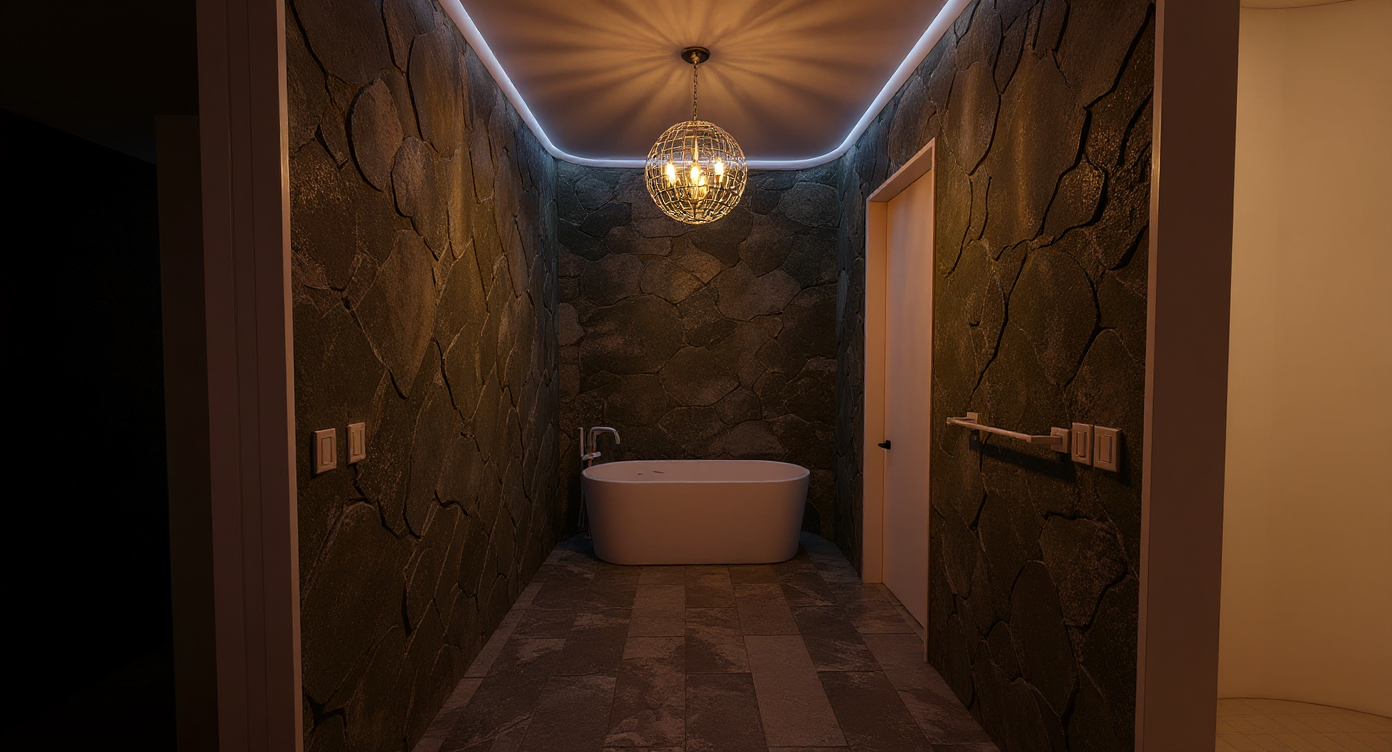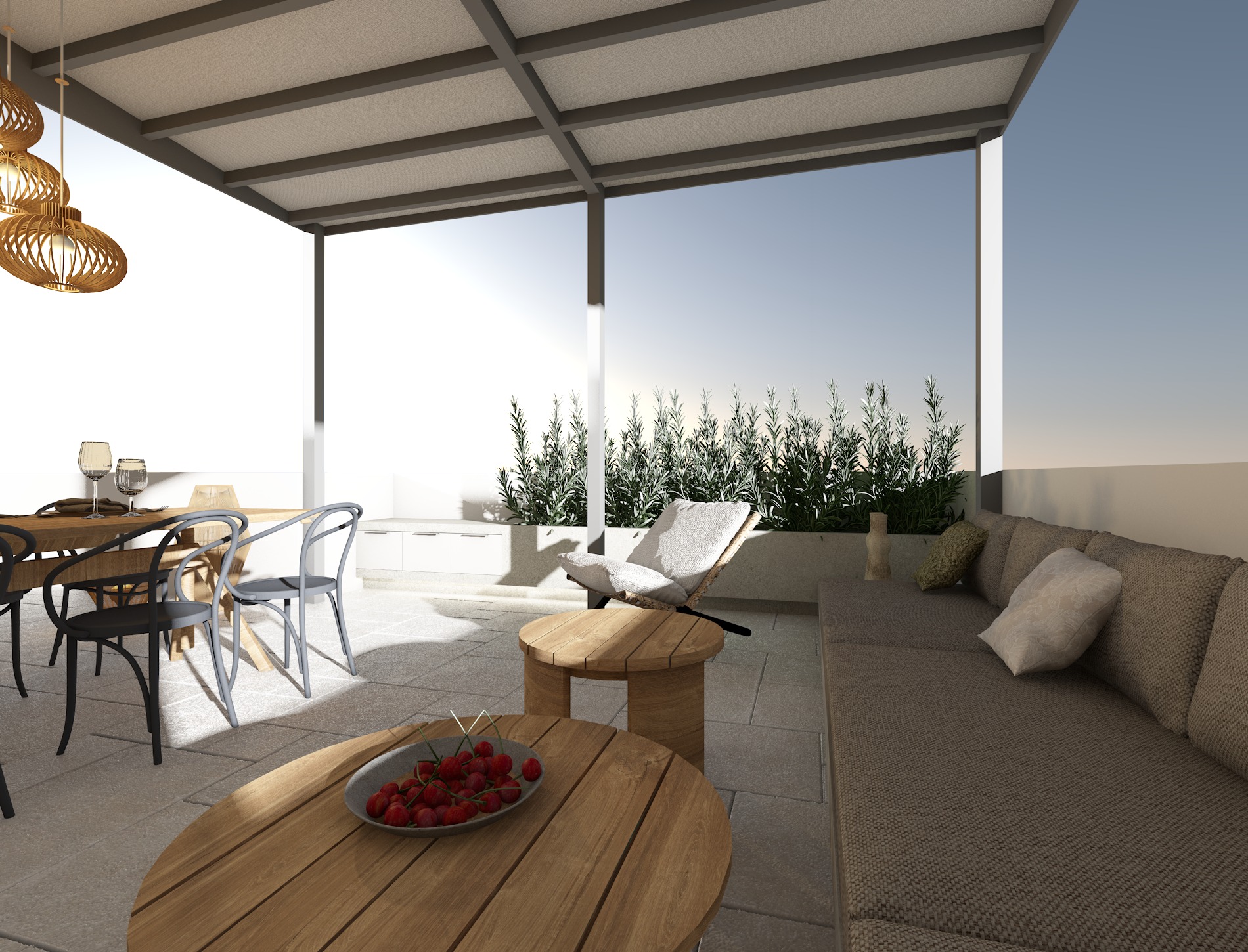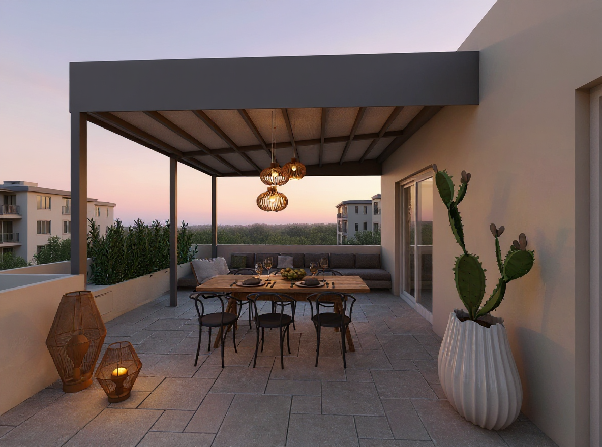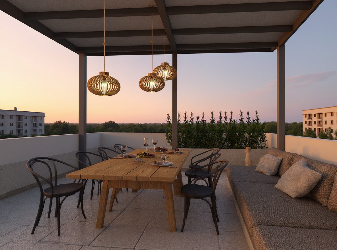 a serene outdoor under a modern pergola three pendant lights with boho casting a warm glow the table is set elegantly with wine glasses and a meal sleek black chairs surround the table adding contrast a cozy earth toned sofa inviting comfort lush green plants peek out from behind the table enhancing the natural feel the sky transitions from soft pastel pink to light blue view to other apartments and greenary creating a tranquil evening atmosphere warm neutral tones dominate the space evoking a sense of relaxed sophistication the veranda is in 3rd floor high resolution render with daylight
