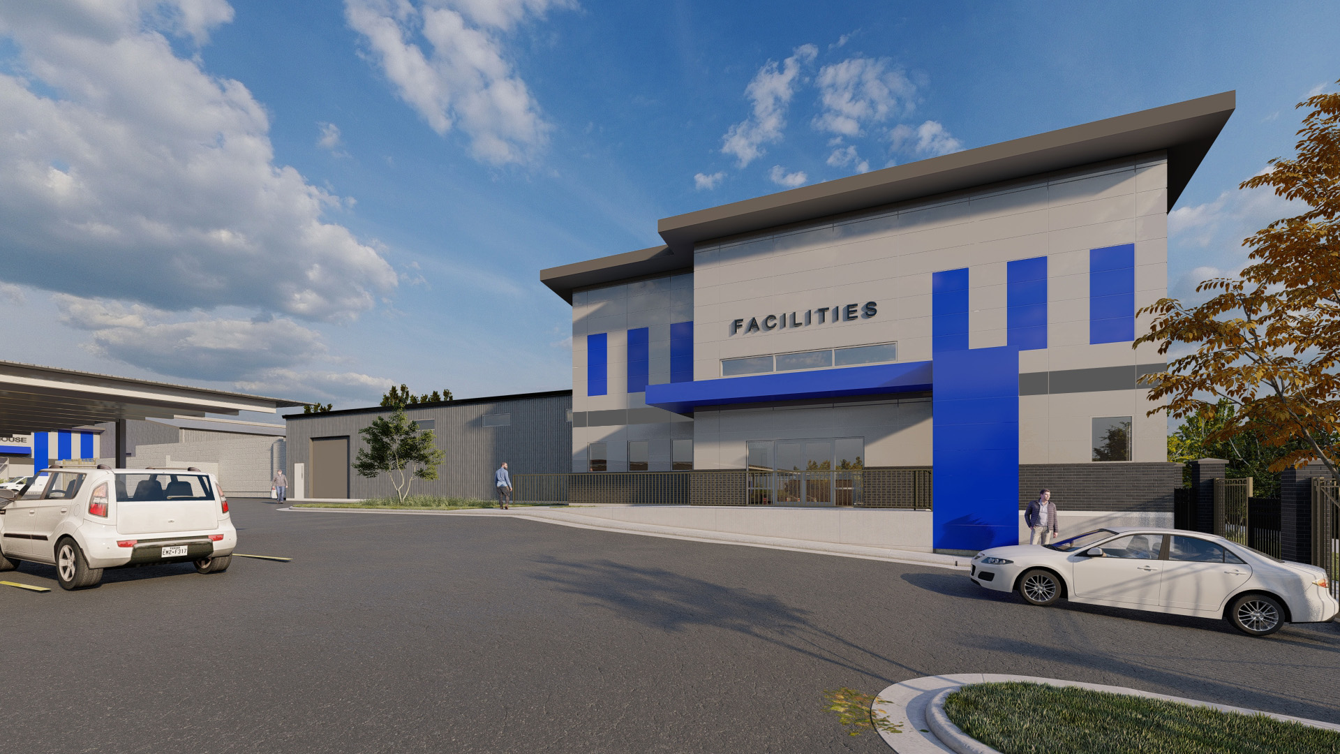 photorealistic architectural exterior render of the provided image preserving the existing building massing proportions and materials but elevating it to a high end realistic visualization add lush landscaped grass areas with a mix of native planting low shrubs ornamental grasses and small trees integrated naturally along the building edges and sidewalks include mature trees in the background only creating a dense green tree line with no visible buildings beyond populate the scene with realistic people casually walking standing and talking along the sidewalk dressed in modern casual attire scaled correctly to the architecture enhance the parking lot with realistic asphalt texture subtle tire wear painted striping and parked cars in neutral modern colors positioned naturally use cinematic realistic lighting with soft sunlight accurate shadows and global illumination lighting should feel warm inviting and professional similar to a golden hour or late afternoon architectural photo shoot apply high resolution materials with correct reflections roughness and depth ensure realistic sky ambient light and atmospheric depth render style ultra realistic high detail professional architectural visualization dslr photography look 8k quality sharp focus natural color balance realistic scale and proportions