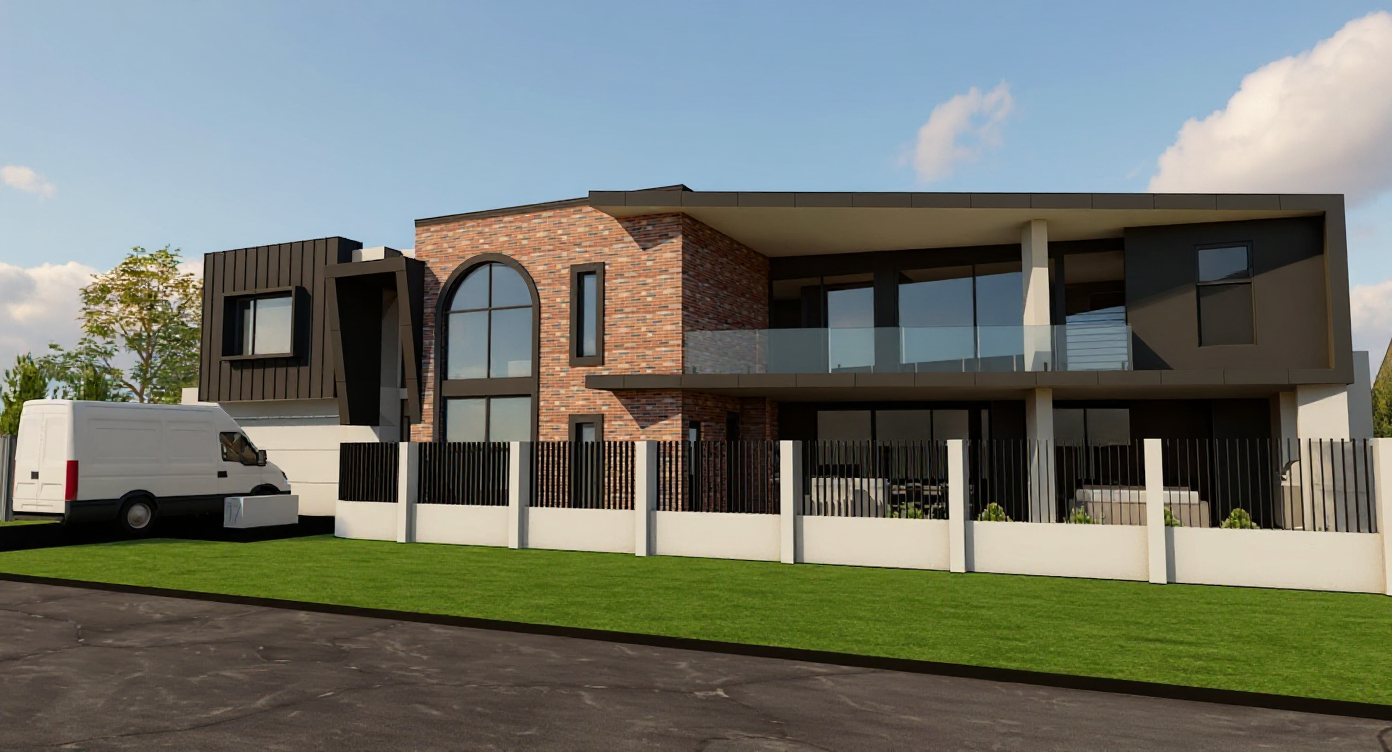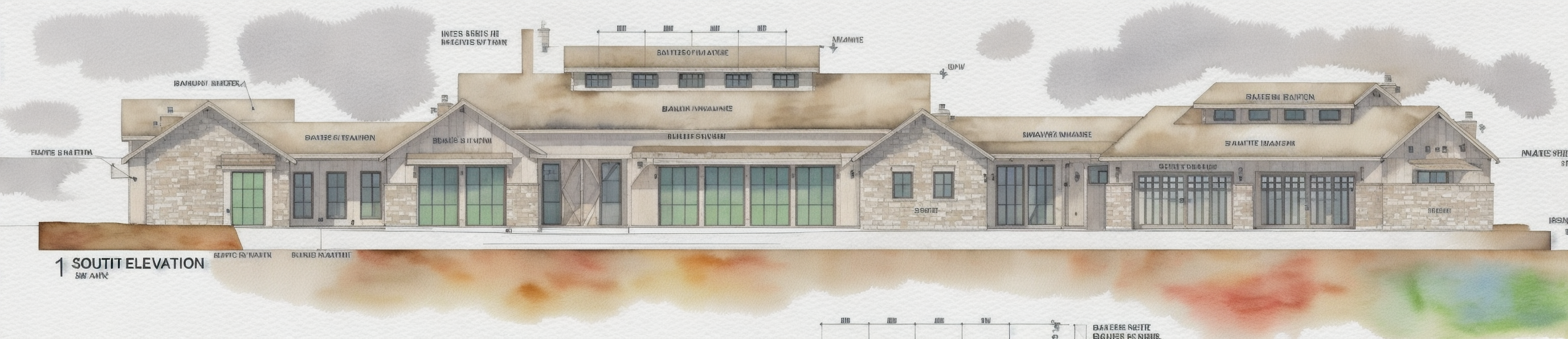 create a watercolor architectural elevation of the attached image do not crop or resize the house vertically or horizontally the full elevation must remain visible do not alter locations of materials rock windows board and batten need to same in the location as pictured on the elevation i uploaded do not alter the design dimensions or material placement only remove all text labels and marks materials rock random mix of grey cream and light brown tones with over grouted mortar roof dark bronze metal standing seam board and batten green brown color slightly darker tone garage doors stained brown wood front door black metal with full glass and matching glass sidelites on both sides details add copper gas lantern sconces on the front add copper gutters to the roofline include light watercolor greenery and sky keep it subtle and soft not overpowering