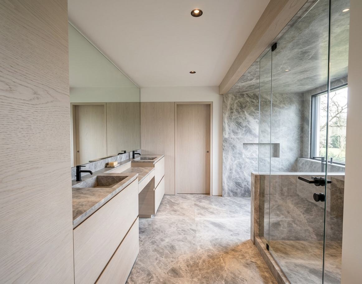 render a modern elegant kitchen with a calming atmosphere use soft white cabinets with subtle detailing the countertops and backsplash should feature luxurious white marble with gray veining incorporate a sleek white range hood above the island the flooring should be a warm natural light wood in a herringbone pattern large windows allow natural light to flood the space highlighting the lush greenery outside maintain a serene and inviting ambiance with soft shadows and a slightly diffused lighting effect