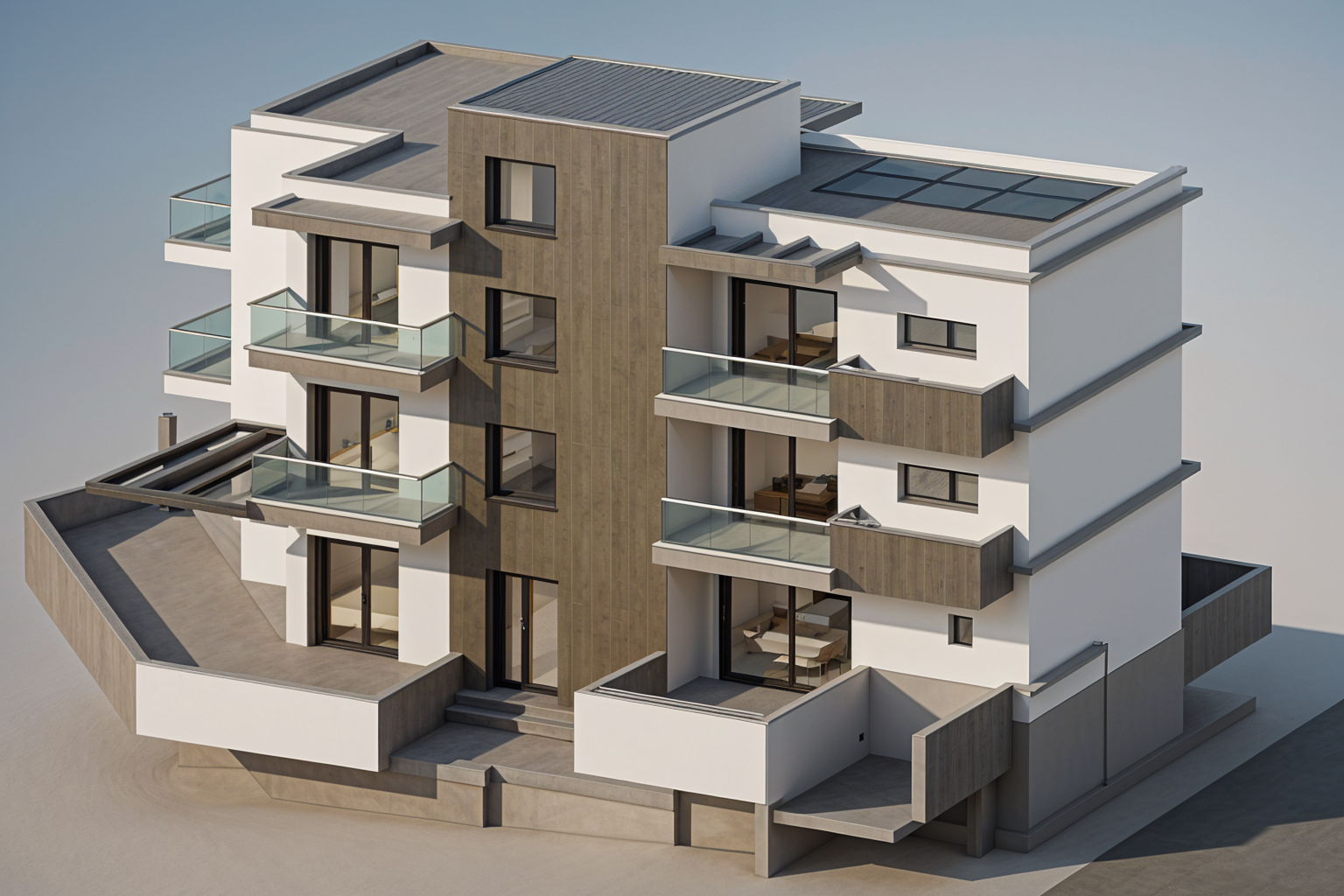 exterior shot white grey walls glass railing turn greens to iron rast pergolas trees