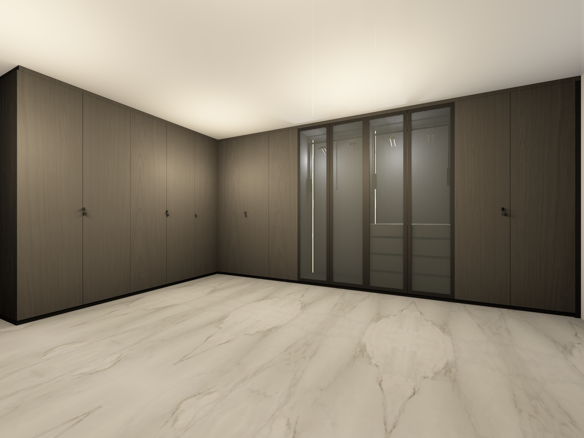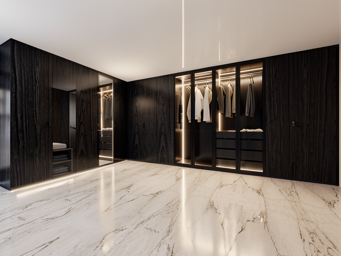 modern walk in closet black oak wood soft led lights