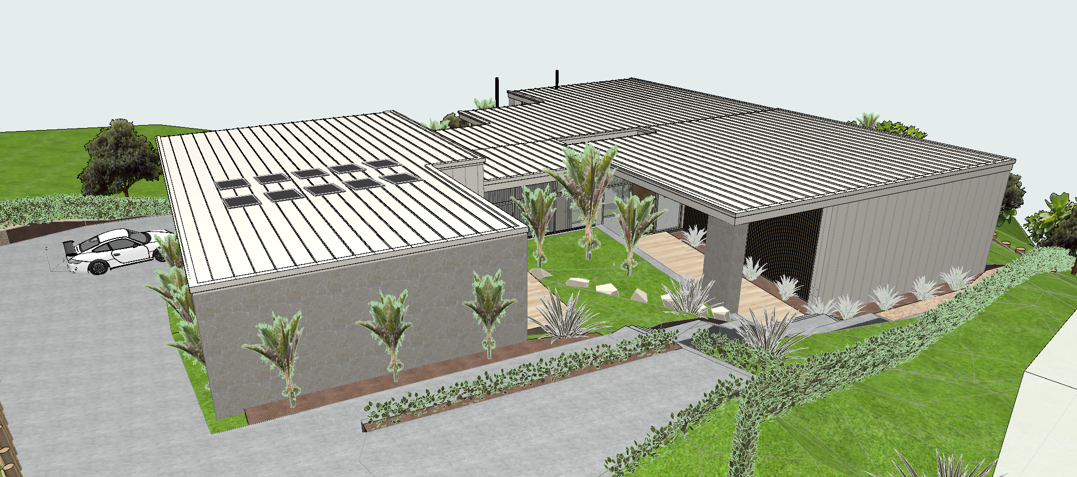 no fencing vegetation native to new zealand light stone schist feature wall on left maintain materials maintain colours light roofing