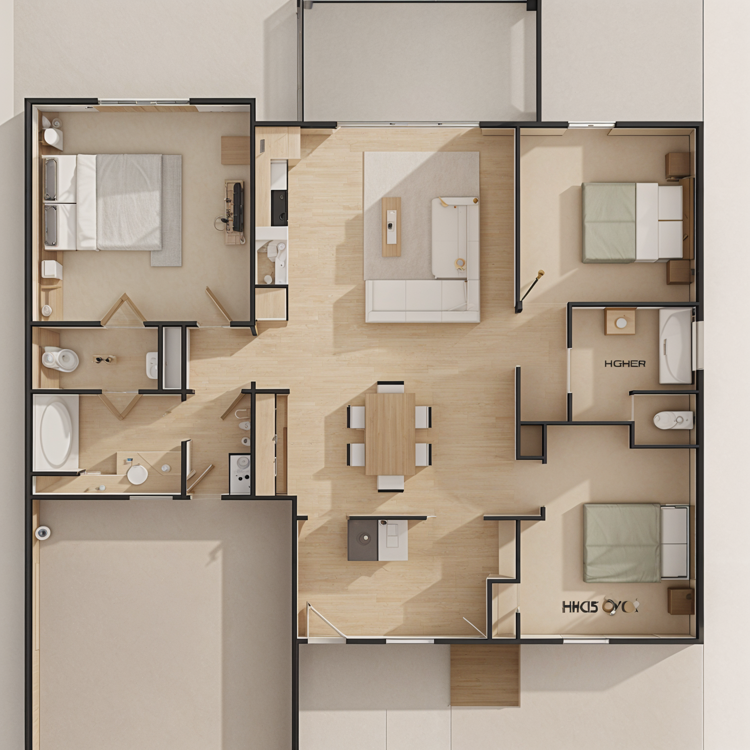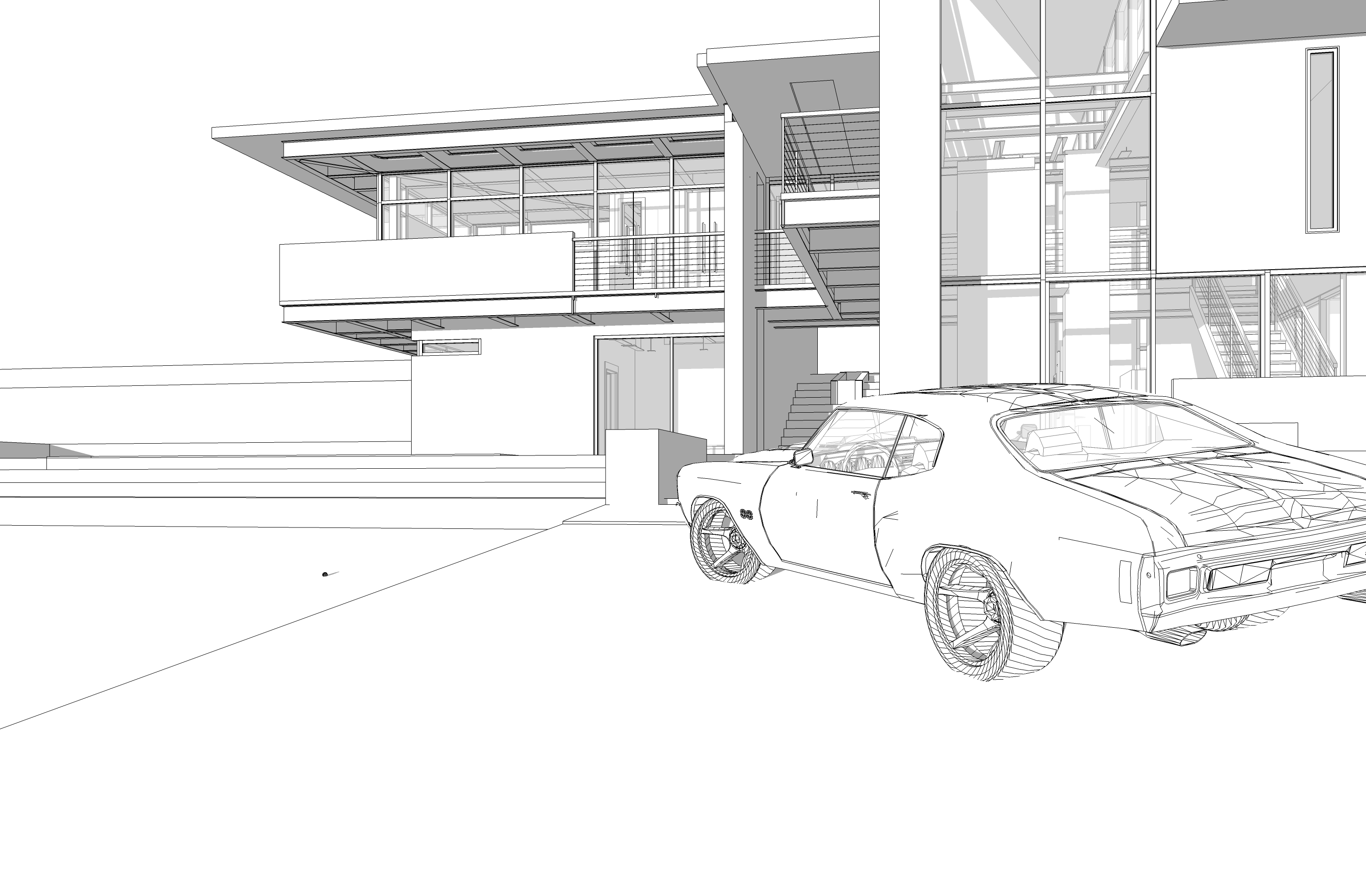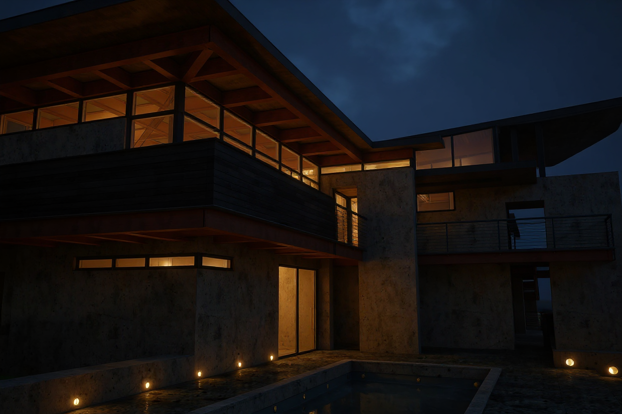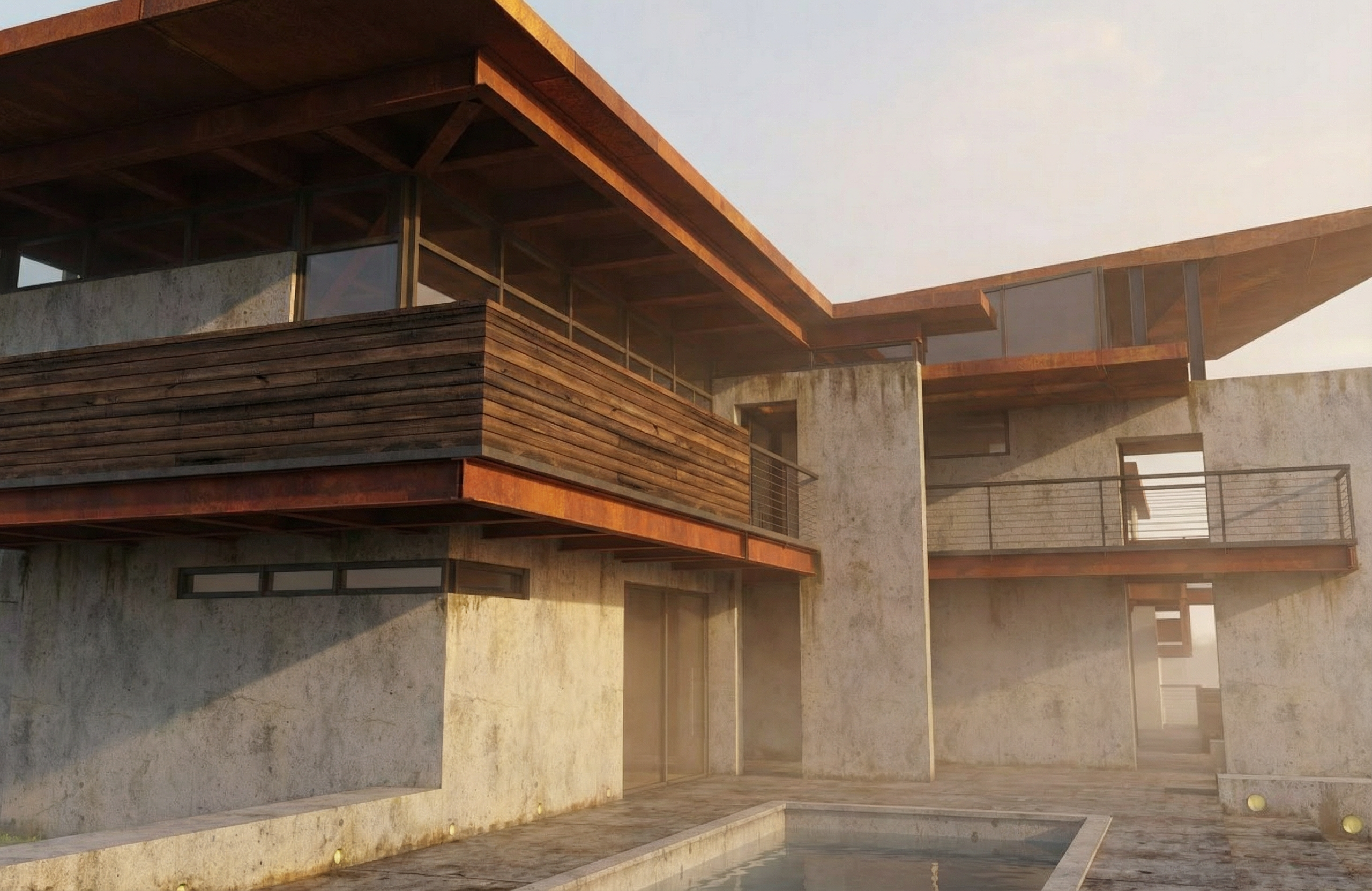 dark wood shiplap siding with corten panels concrete accent walls sunlight on building face dusk fog