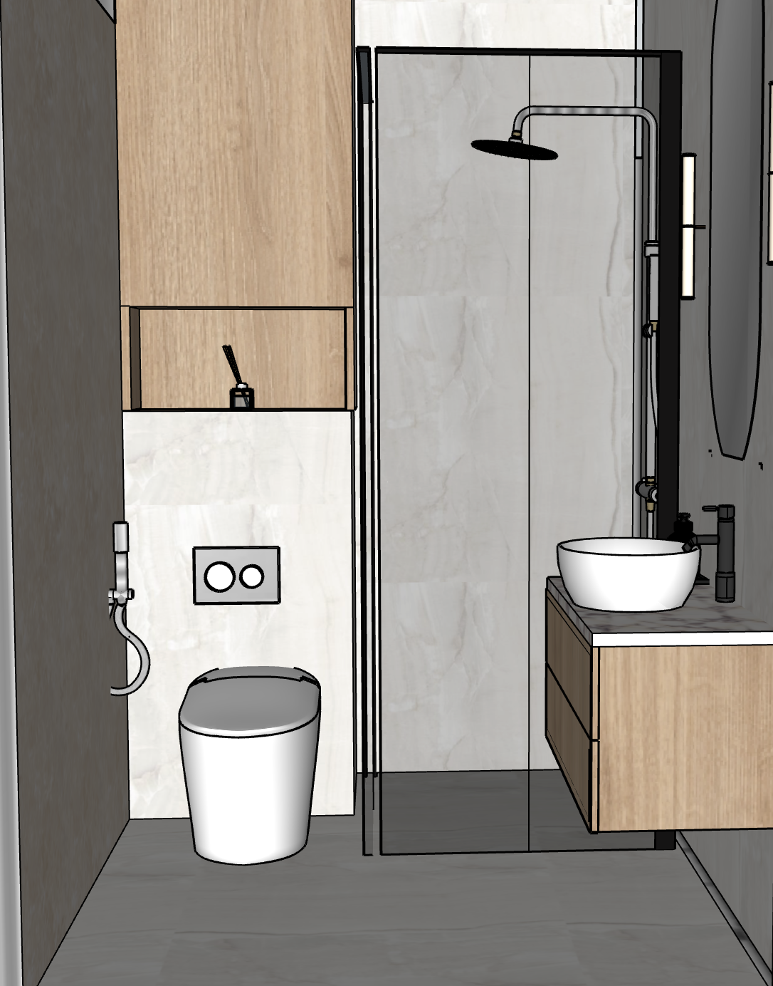 wall tiles are shiny floor is matt tap is shiny chrome as well is buttons above the toilet shower glasses are frameless oak is light oak color