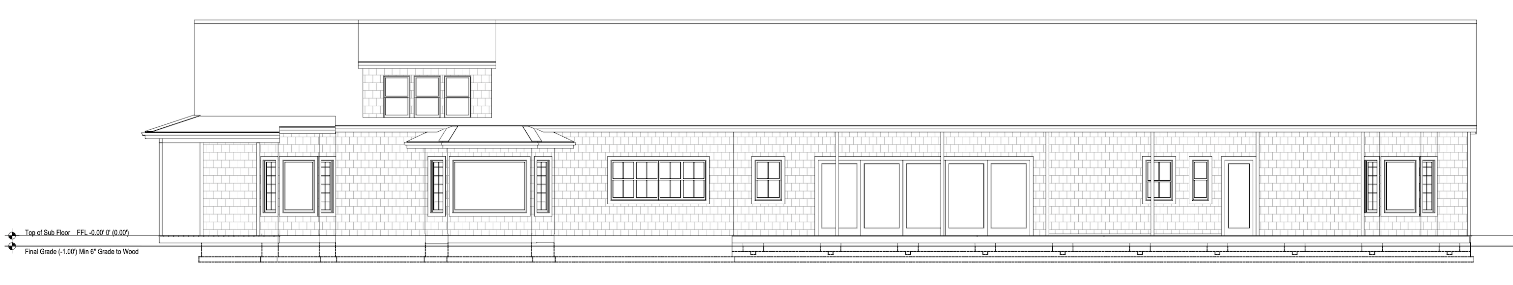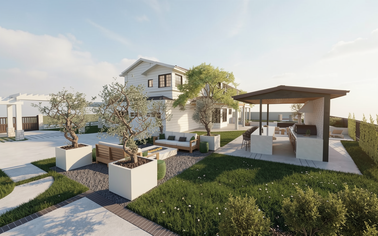 generate photo realistic exterior elevations the house is shingles painted white the doors door trim and window trim are robins egg blue the roof is dark grey