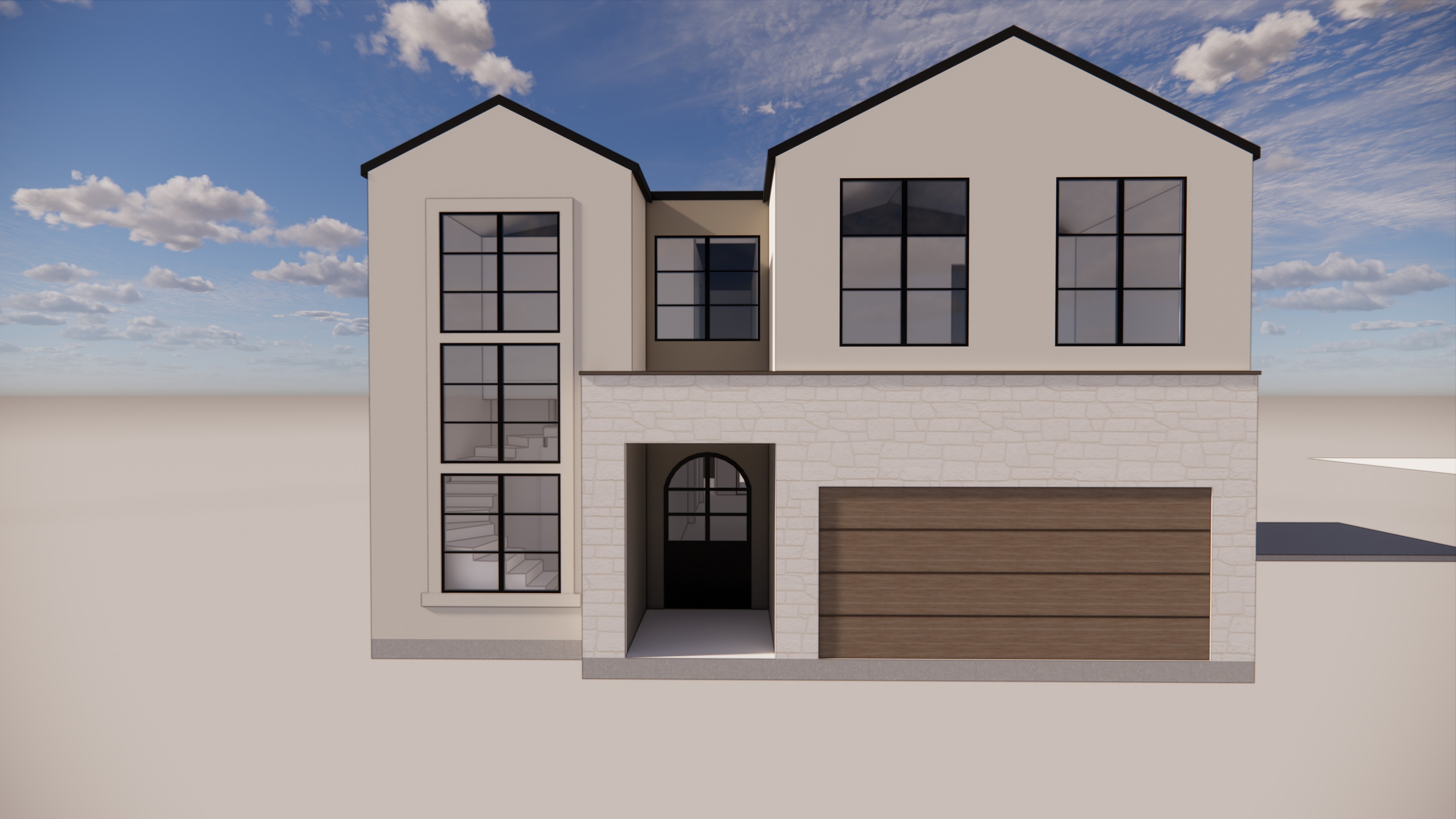 can you do splitface stack stone on the front and make the top portion a neutral brick and the rest stucco with small tudor accents above the windows
