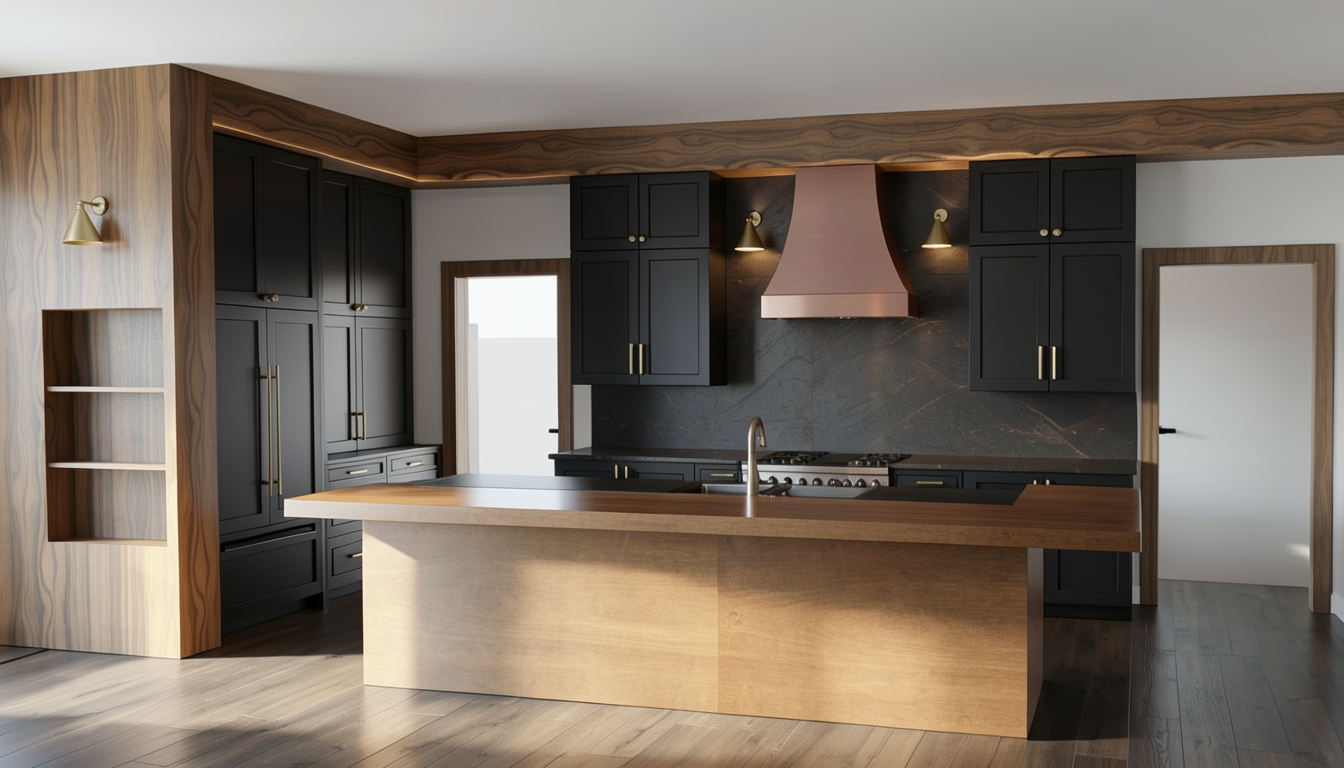 photorealistic render of a custom kitchen interior maintain original design and colors exactly do not alter color palette perimeter cabinetry is dark stained wood almost black with visible natural wood grain trough the dark color and a soft satin finish not painted not flat cabinet hardware is brushed brass handles and knobs kitchen island is a warm medium caramel stained wood with visible grain and a satin finish island and perimeter countertops match exactly in material and color range hood is brushed antique copper that almost looks used with a soft aged patina not polished not shiny wall sconces on either side of the hood are brass with a warm brushed finish lighting is warm 2700k 3000k a continuous wood soffit architectural band runs along the top of the cabinetry in an antique wood tone with subtle aging the faucet is matte black in the island doorways are pocket doors with trim that matches the surrounding wood tones use realistic natural lighting soft shadows and accurate material reflections emphasize wood grain texture and depth and subtle metal reflectivity avoid overexposure avoid high gloss finishes and do not change or reinterpret any colors there are no seams in the island and the doors are pocket doors remove the handles on the pockets doors