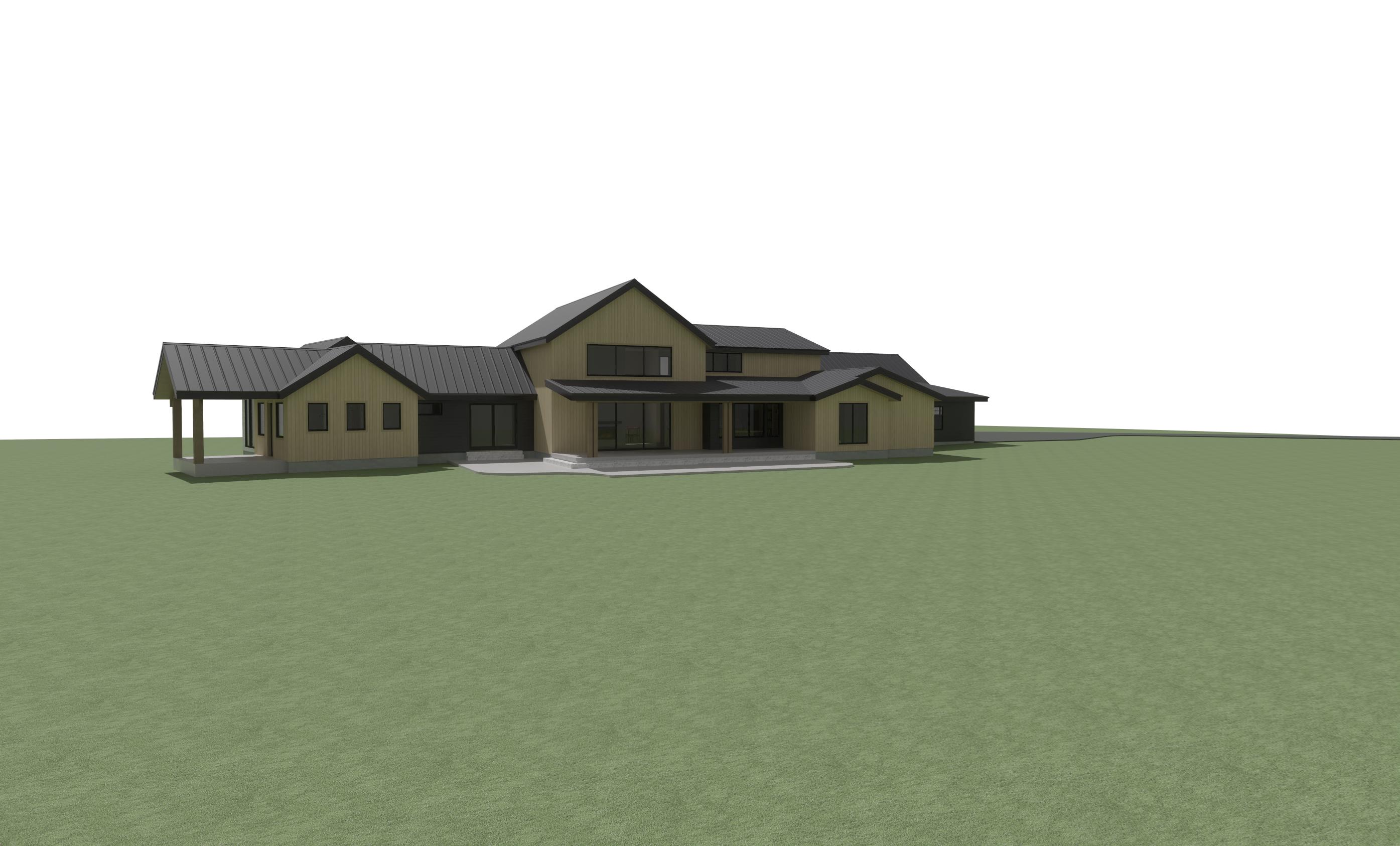 enhance the realism of the existing architectural design while maintaining the same materials and textures focus on realistic lighting shadows and surface details to create a lifelike appearance ensure the mixture of wood siding is preserved in the correct areas making them look authentic and cohesive this is in montana add montana landscape with nice landscaping near the house add montana vegetation around the house make wood siding modern vertical 10 wider plank siding natural cedar light warm honey tone clear matte finish clean sharp edges minimal knots contemporary scandinavian farmhouse style high end residential exterior the siding is not board and batten it is wide planks with realistic wood grain texture make the wood siding planks the same width as the image reference do not add a chimney add mountains far off in the distance do nice landscaping in front of house and and native montana vegetation in forground no trees