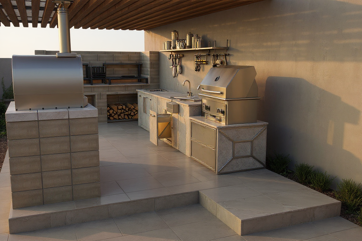 luxury uae villa backyard night scene private residential outdoor kitchen exact structure preserved warm undercounter lighting pergola beam strip lighting subtle wall wash lighting polished stainless reflections stone textures visible minimal planter lighting at slab edges only dark enclosed backyard walls cinematic architectural night render no people no countryside no open landscape no furniture added no layout change