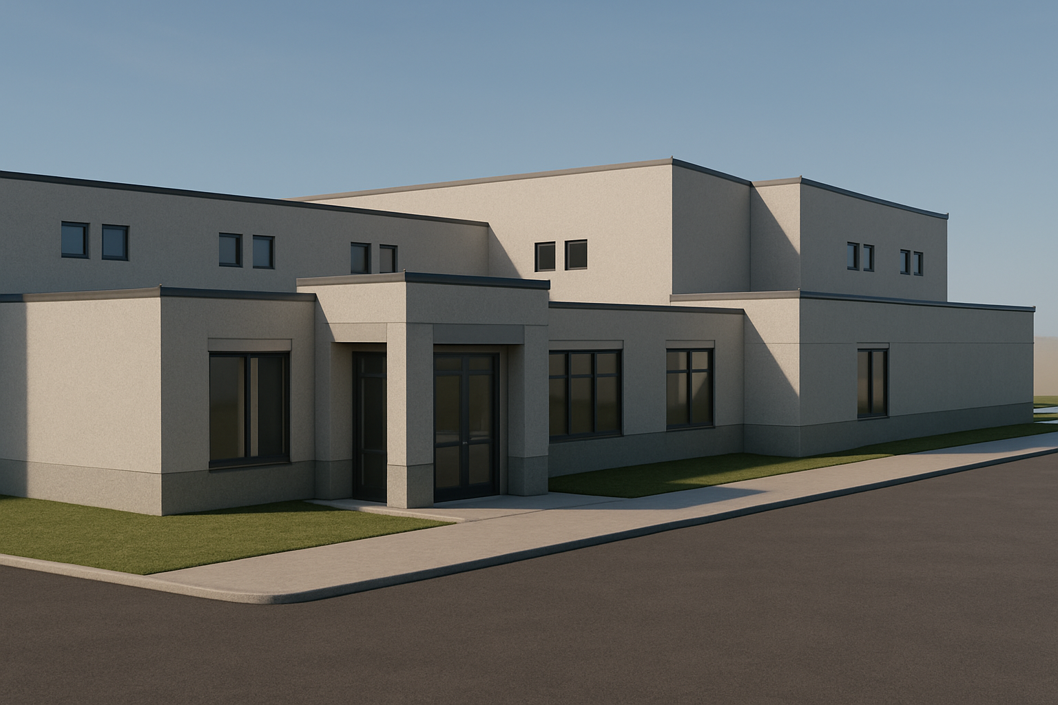use the exact building shape i provided and add finished with precast for the whole tall part of the building and brick wainscoting up 3 for the short part in the front