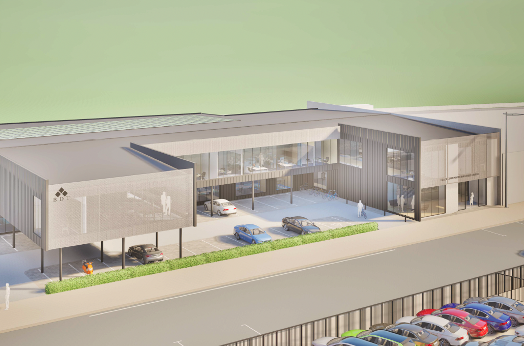 generate a modern architectural building with a sleek minimalistic design the building features large glass windows with metallic gray framing creating a stylish contemporary look the exterior walls are a muted gray and the roof has a smooth matte finish the surrounding area includes parked cars in shades of silver blue and white on a smooth asphalt surface incorporate lush green hedges along the perimeter for a touch of nature use soft ambient lighting to enhance the atmosphere and set against a clear pale green sky evoking a calm serene environment