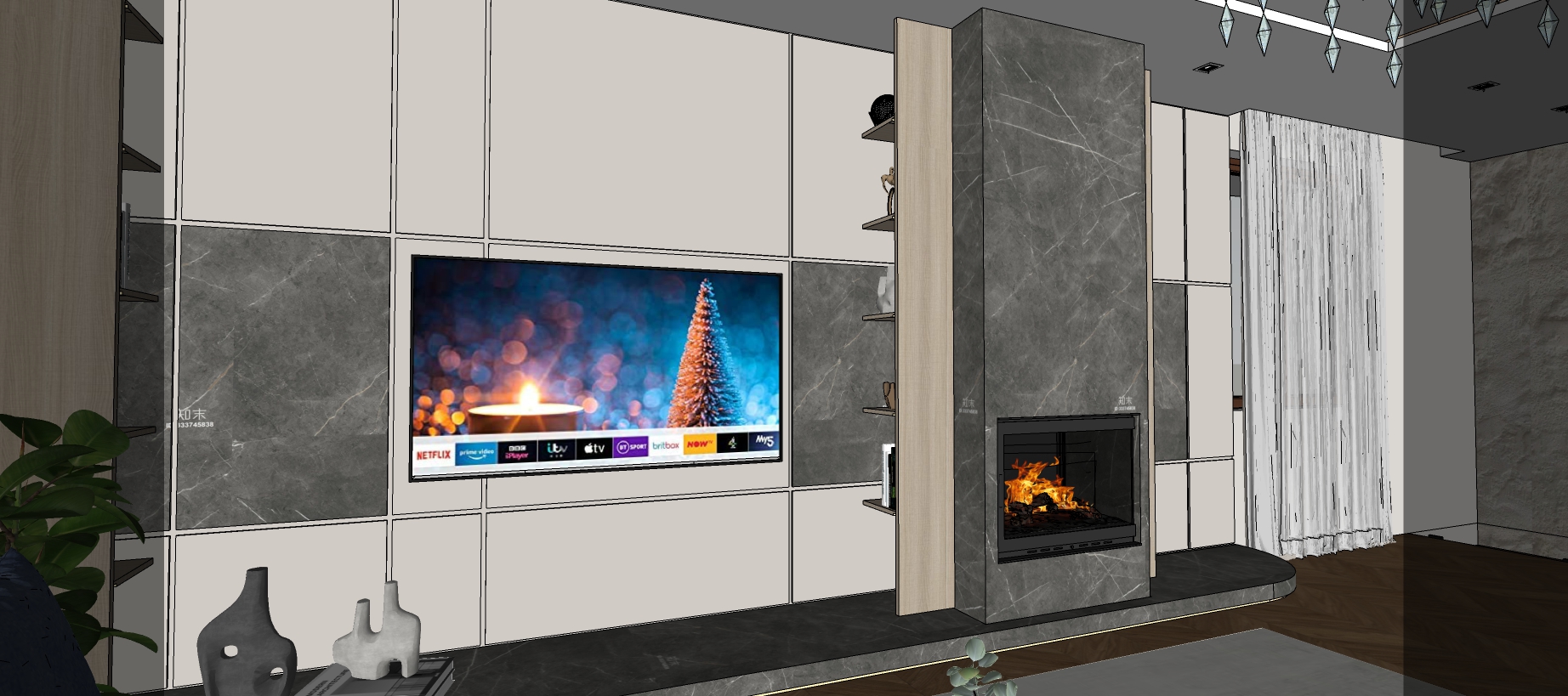 render a modern kitchen with a sophisticated and elegant atmosphere use a monochrome color palette and incorporate sleek contemporary elements the walls are a soft muted gray while the cabinetry is an off white the kitchen island should have a beige countertop with a minimalist design add a dark gray overhead extractor hood in the center the backsplash has a marbled texture in shades of gray the floor has a warm dark wood herringbone pattern introduce a touch of greenery with a tall lush plant in the corner include subtle metallic accents with black bar stools and gold details the lighting is soft and ambient creating a cozy and inviting atmosphere
