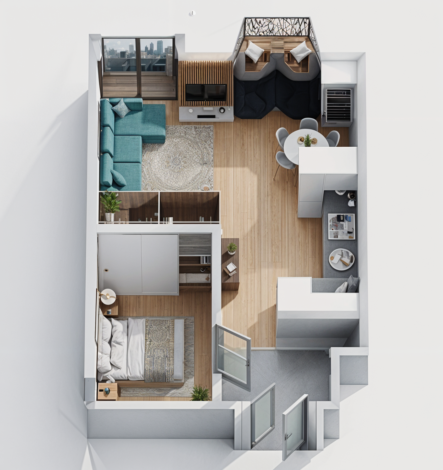 soft white modern kitchen kitchen realistic render high detailed add kitchen accesories black frame of the glass cabinets glass inner shelves mirror on the end of glass cabinets