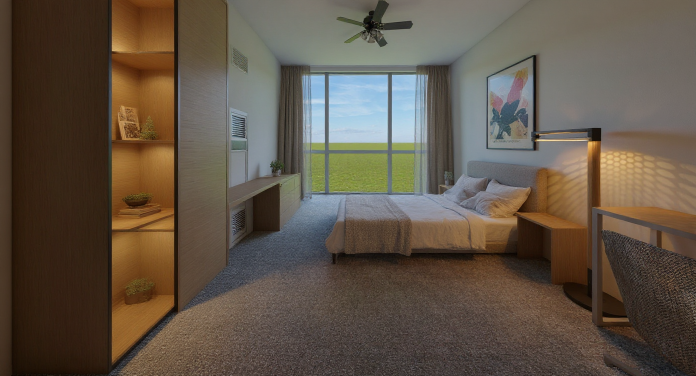 modern wooden siding home at top of a low hill wooden framings for windows and doors